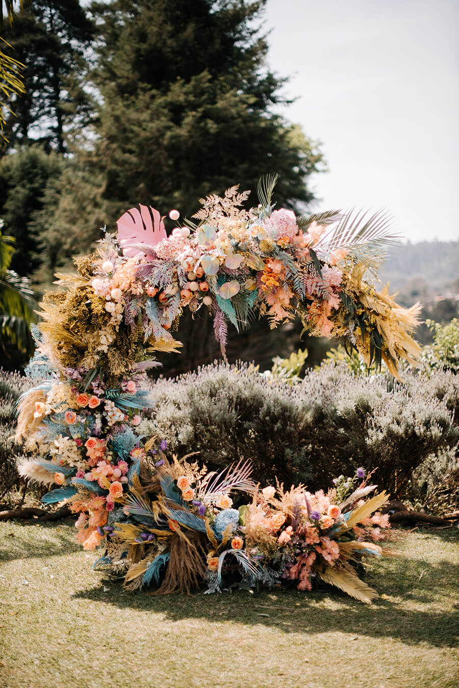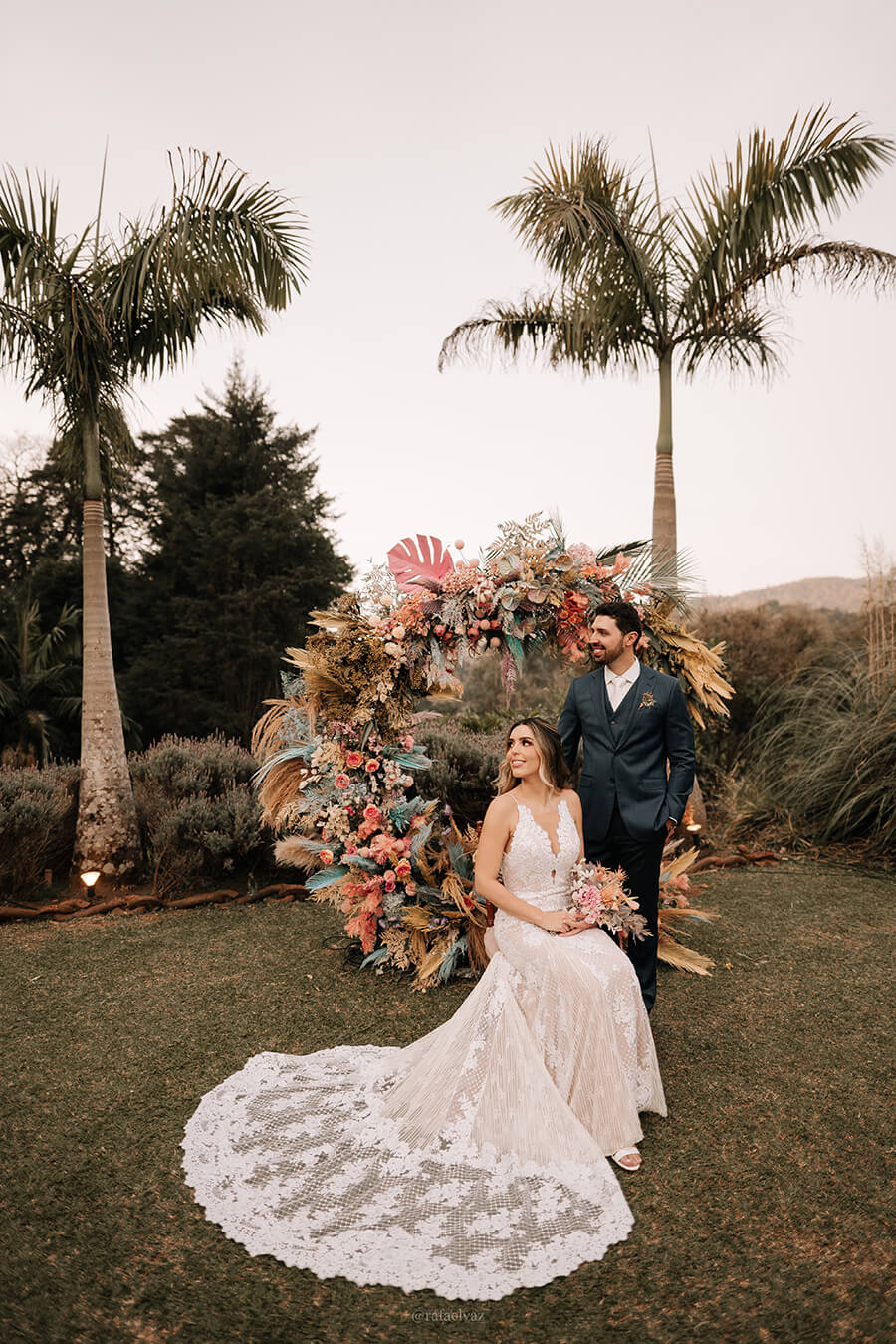 O resultado foi um cenário realmente único com vários elementos que a gente ama, como os arranjos suspensos de mosquitinhos, folhagens secas tingidas e um altar em formato de lua que ganhou nossos corações e rendeu fotos incríveis pós cerimônia!