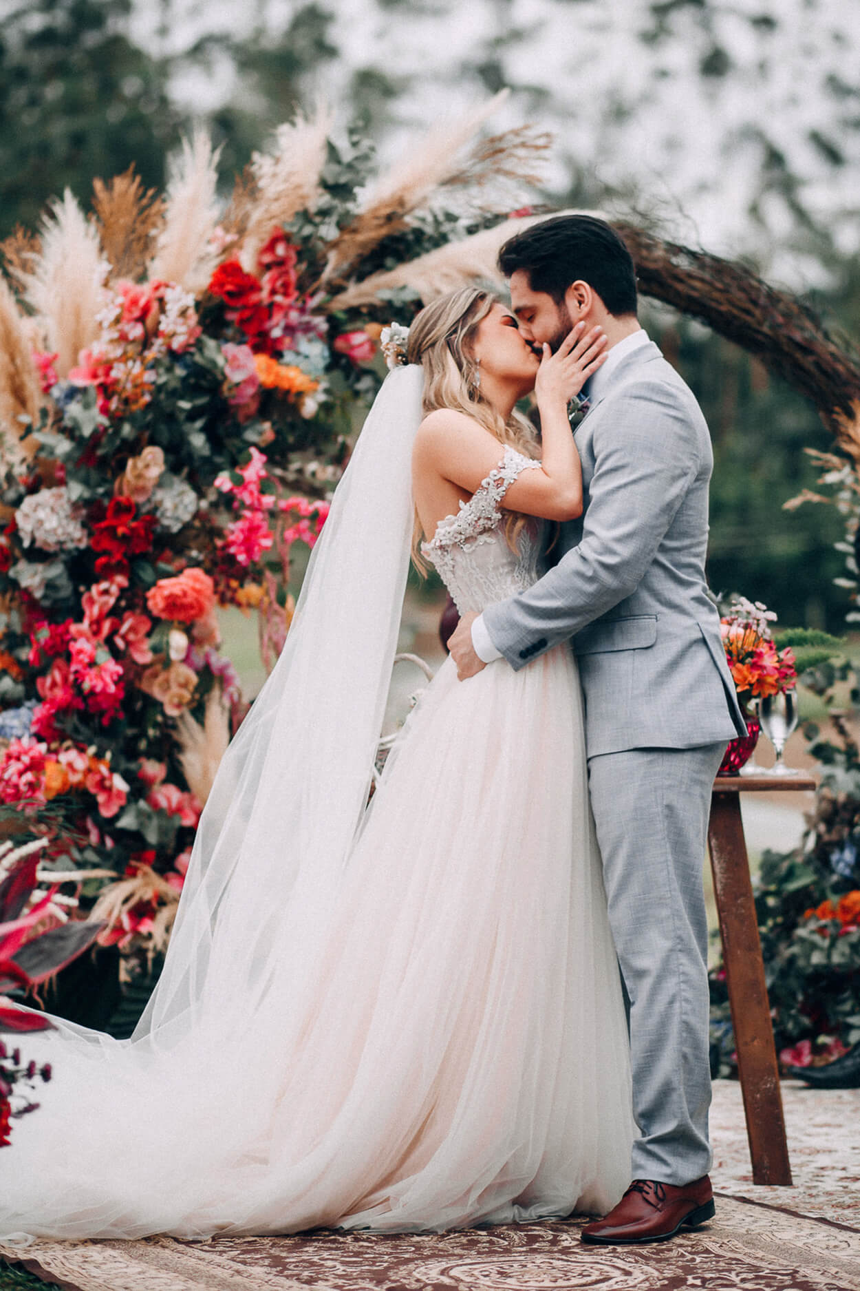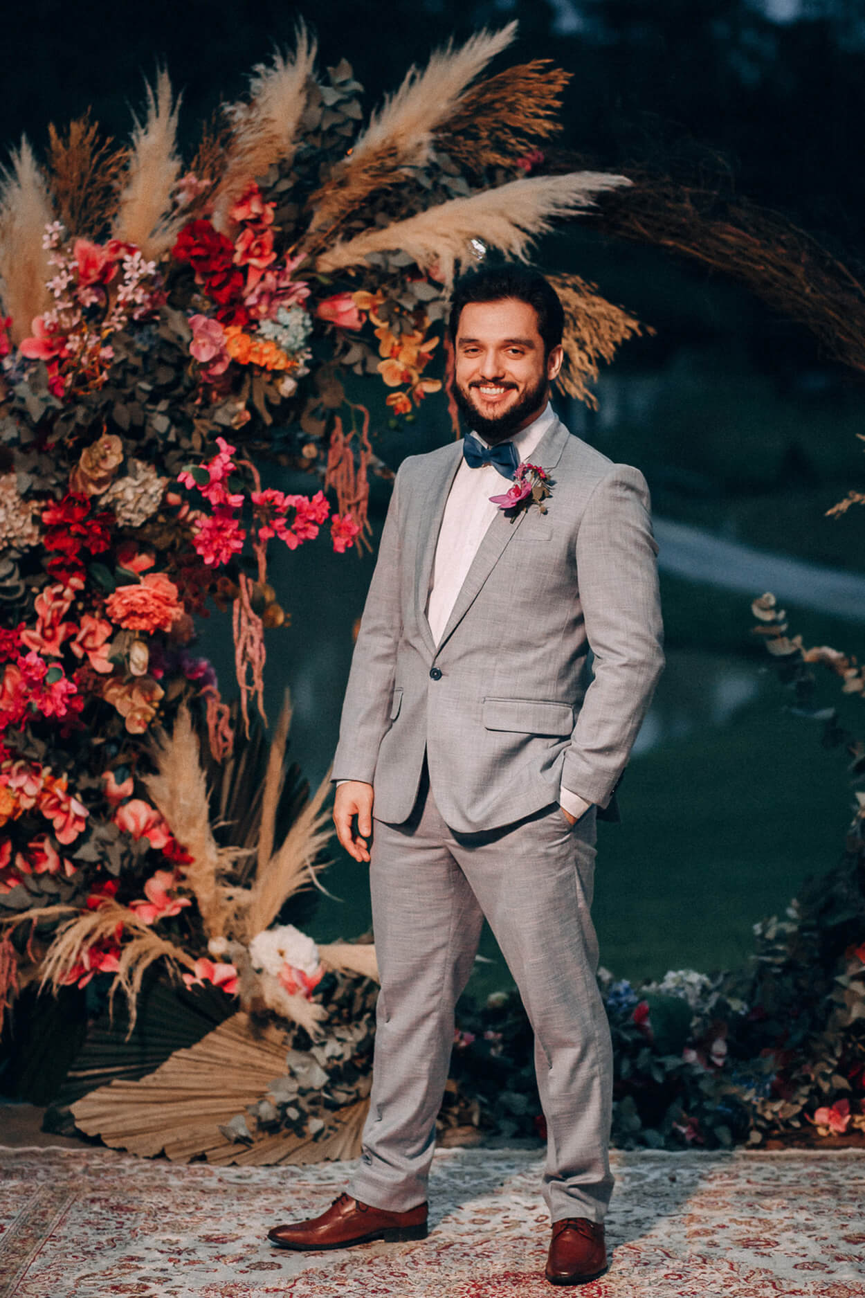 A noiva optou por um buquê que segue a mesma proposta da decor, ou seja, maxi e com cores quentes. O azul também é bem marcante em todo o casamento, porém o noivo preferiu usar a cor na gravata, de forma mais discreta e elegante.