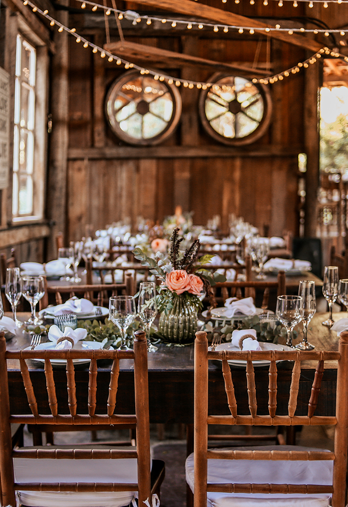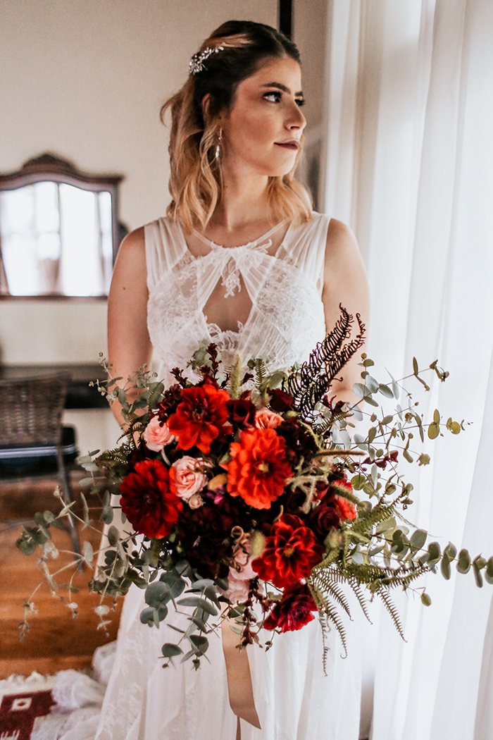 MAs seguiram um conceito Boho/Shabby chic. E dentro desse conceito escolheram uma paleta de cores com branco, verde, vermelho e rosé.