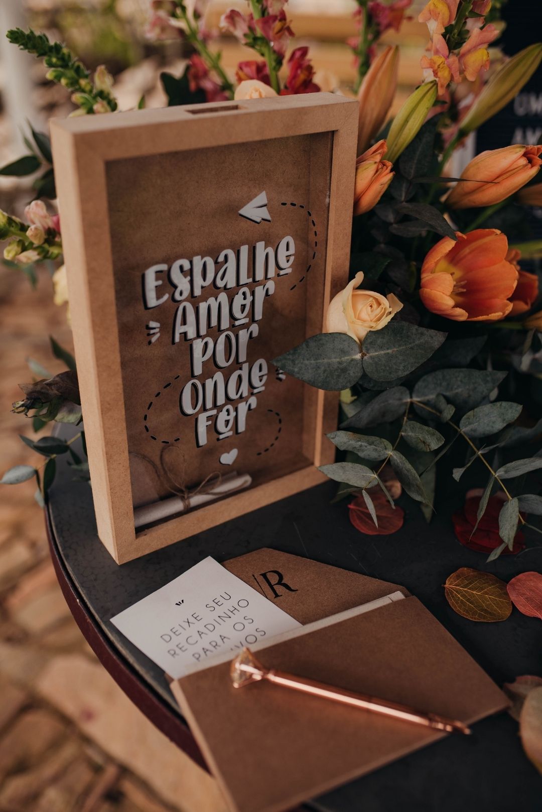 Nada como um projetinho DIY para deixar o casamento com mais personalidade, não é mesmo? O Alexandre fez os dois cadernos de votos de couro e o banner de boas vindas de tecido, além de ter criado toda a identidade visual do casamento (convites, menus, logo das lembrancinhas).