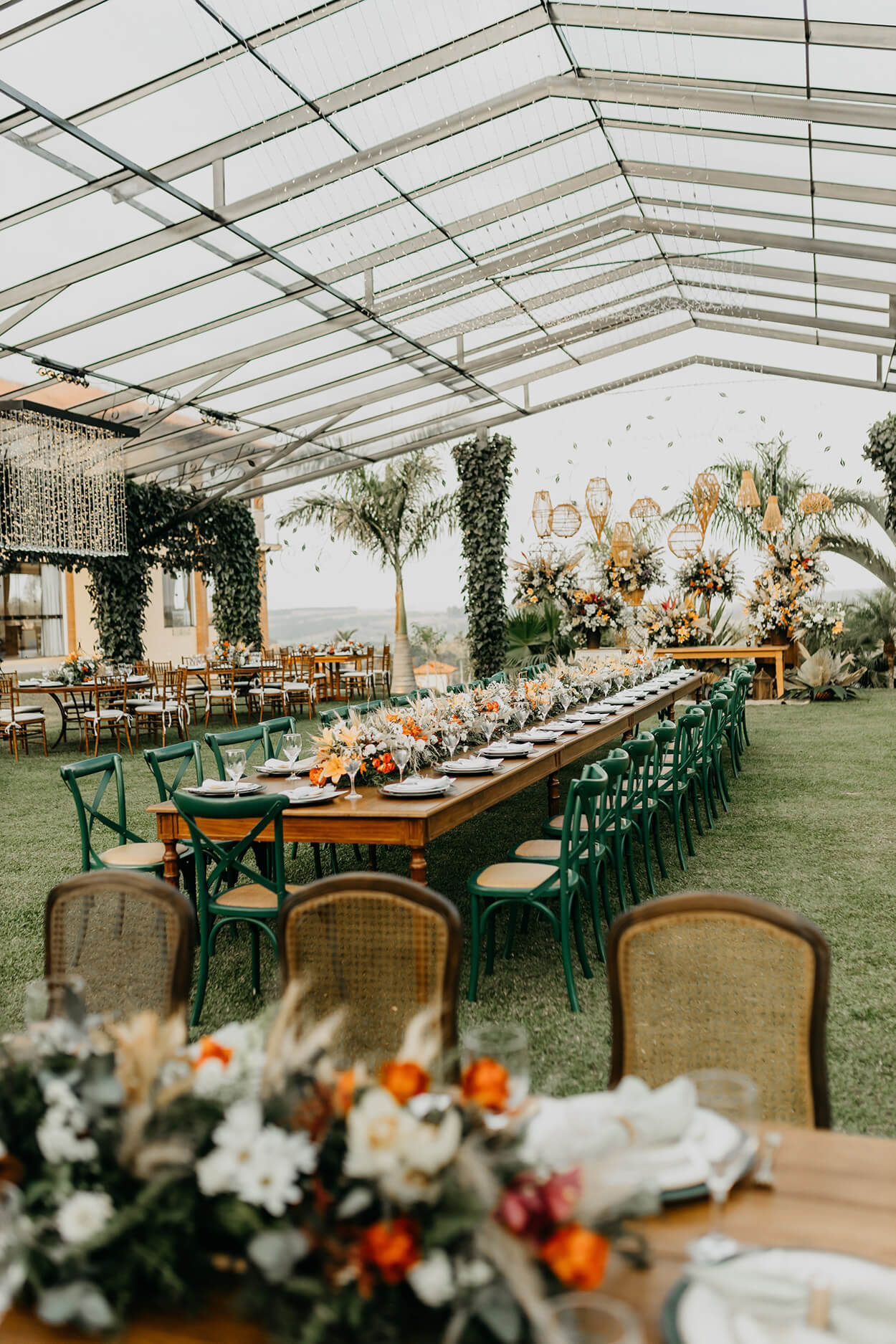 As madrinhas arrasaram com vestidos em tom verde esmeralda com um toque cintilante. Embora a cerimônia tenha ocorrido durante o dia, esse brilho é muito bem-vindo. Uma vez que acrescenta mais personalidade em uma festa exuberante.