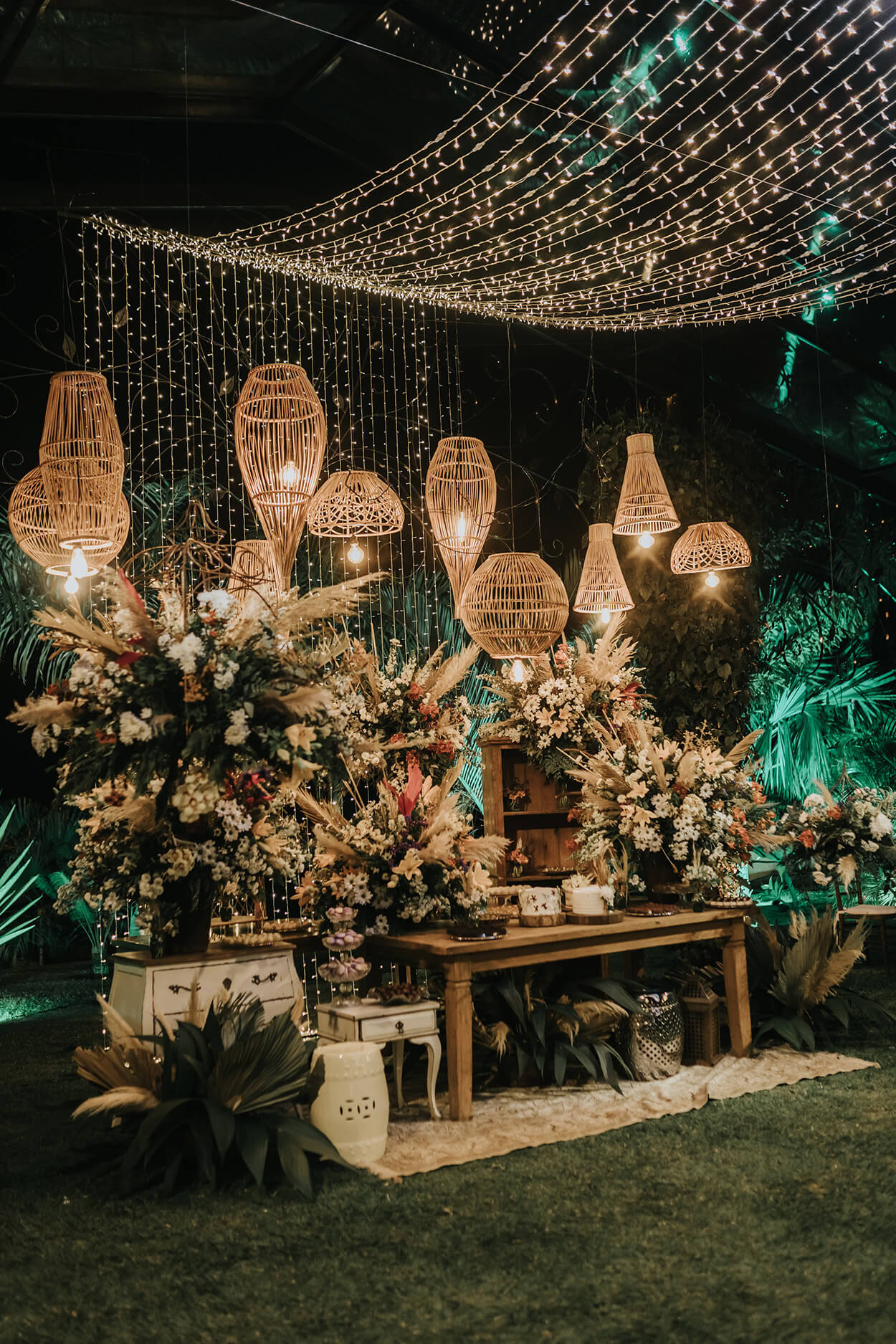 A mistura do estilo boho com a exaltação dos elementos secos + a abundância de greenery criou um cenário único.