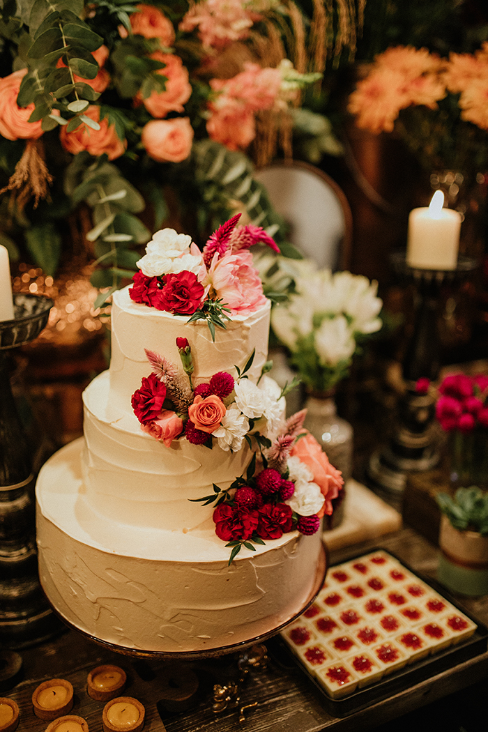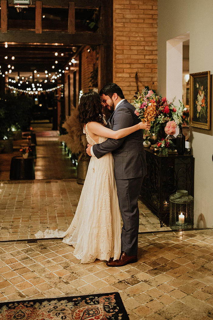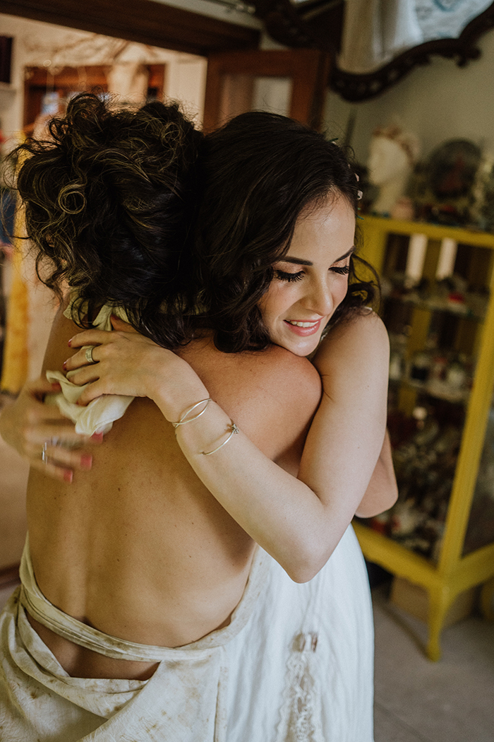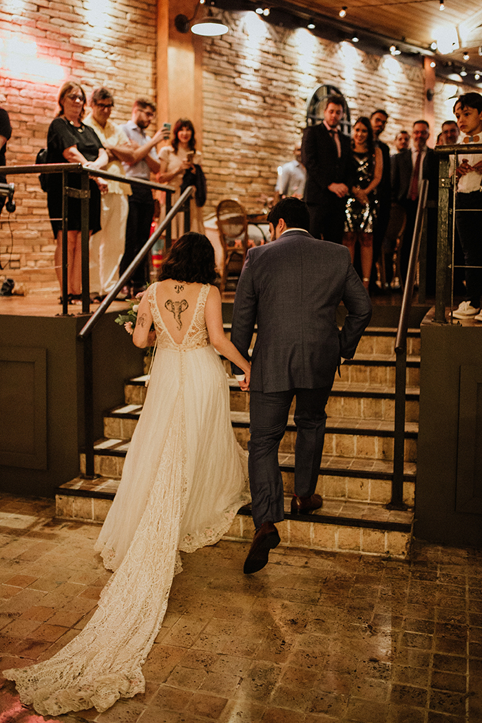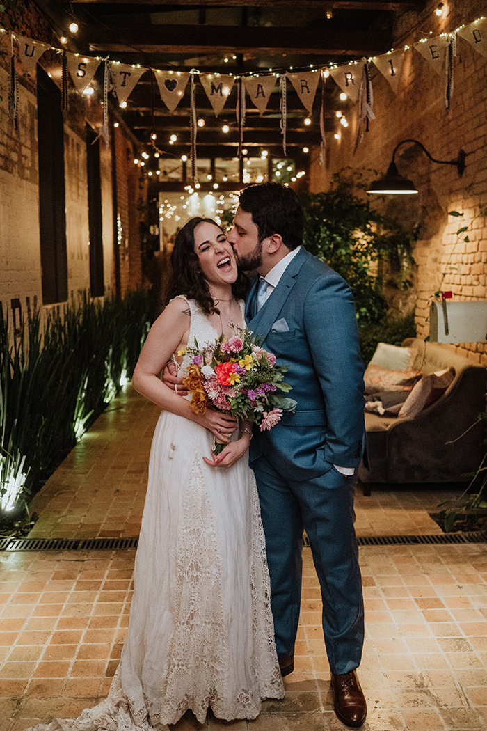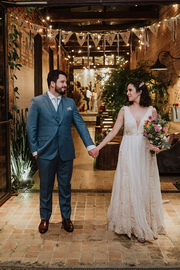 Quando os dois decidiram casar, sabiam o que não queriam: cerimônia impessoal e tradições que não fizessem sentido. A decoração do espaço ficou bem romântica, com flores silvestres e coloridas em cores vivas. Eles não escolheram as roupas dos padrinhos e madrinhas, foi bem natural e orgânico, e da vontade de cada um.