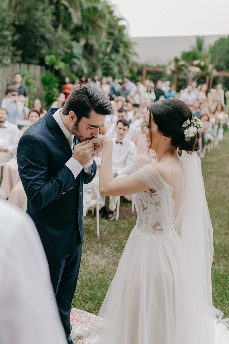 “Fizemos uma surpresa para os nossos pais durante a cerimônia! Lavamos os pés deles, em sinal de gratidão por tudo o que fizeram e por todo o tempo que se dedicaram a nós dois. Foi muito emocionante, a gente não esperava a emoção gigantesca que esse ato alcançou, tanto em nós e nos nossos pais quanto nos nossos queridos que estavam ali com a gente.” O pai da Camila sofreu um acidente de moto dias antes do casamento, quebrou alguns ossos da perna e precisou entrar de muletas. Lavar os pés dele, naquelas condições, foi muito emocionante para ela. A cerimônia foi muito gostosa, leve, feliz, os amigos tocaram as músicas mais lindas que os dois escolheram, os padrinhos estavam radiantes, os votos foram extremamente importantes e especiais para eles, foi um dia muito especial.