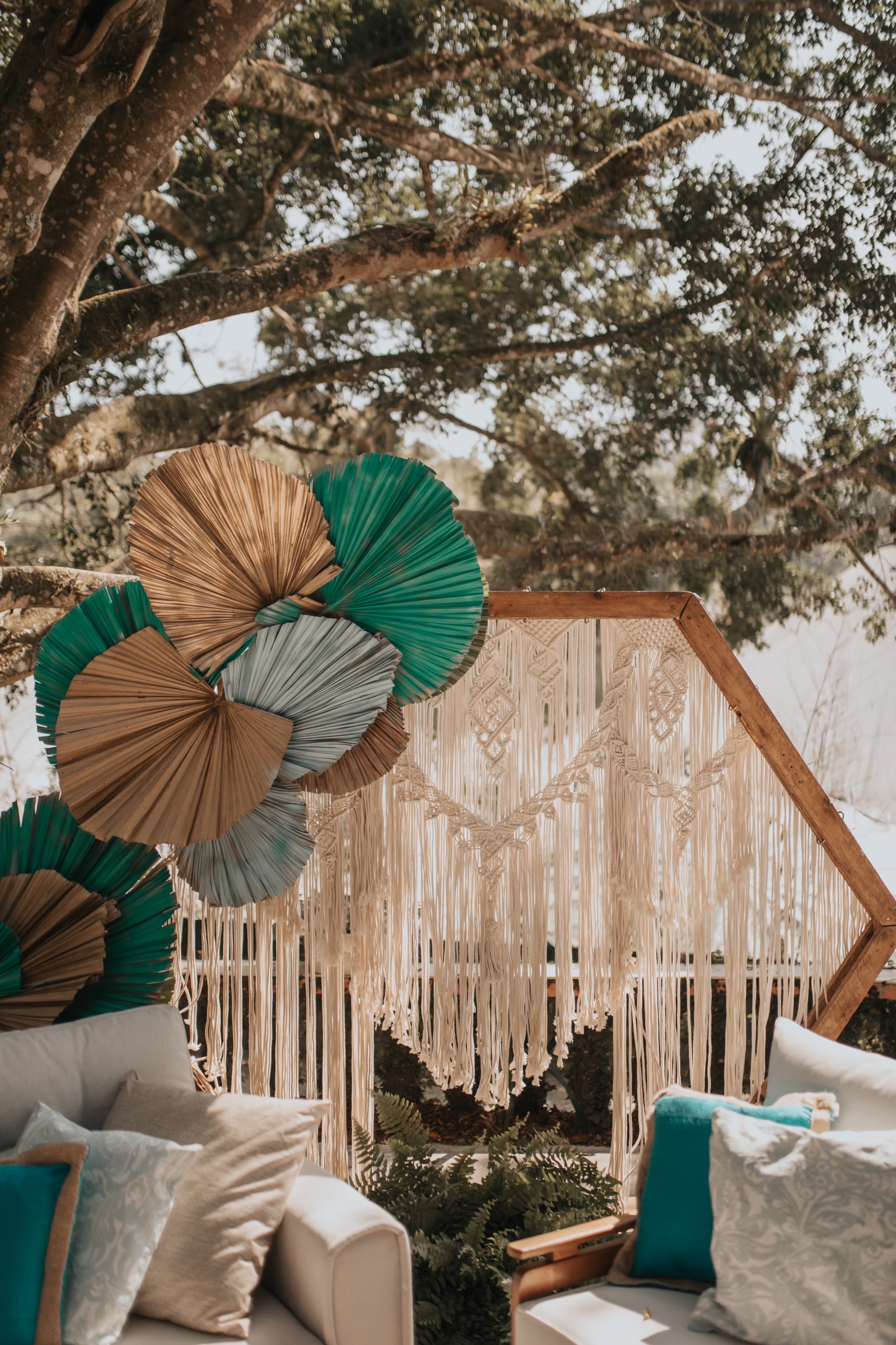 - A decoração com folhagem seca, tingida e cheia de capim dos pampas