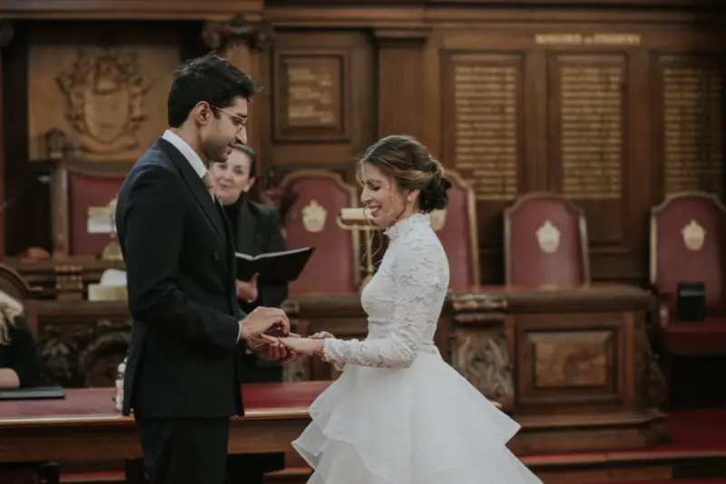 Ele é realizado no cartório e o registro garante que o casal está legalmente unido.