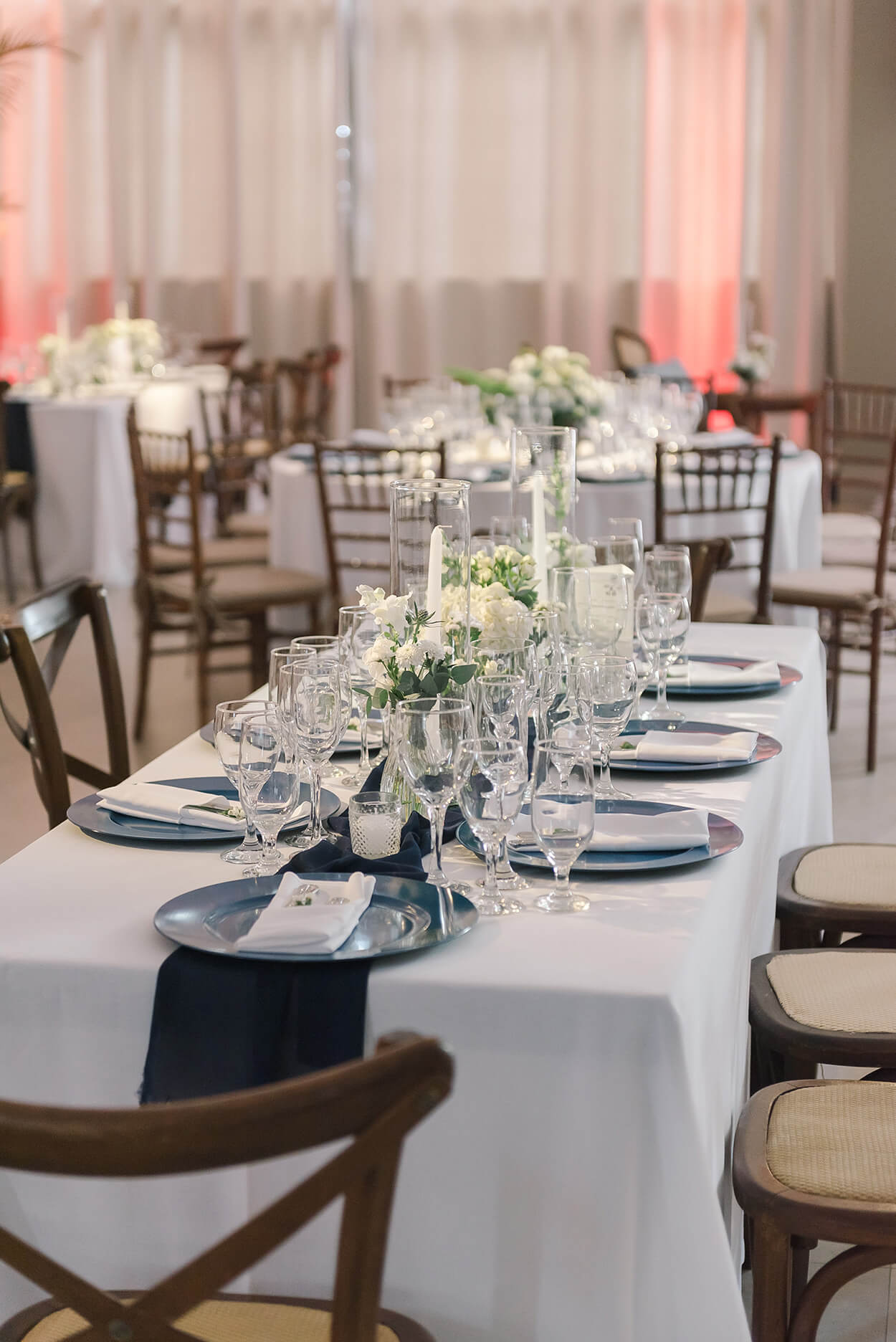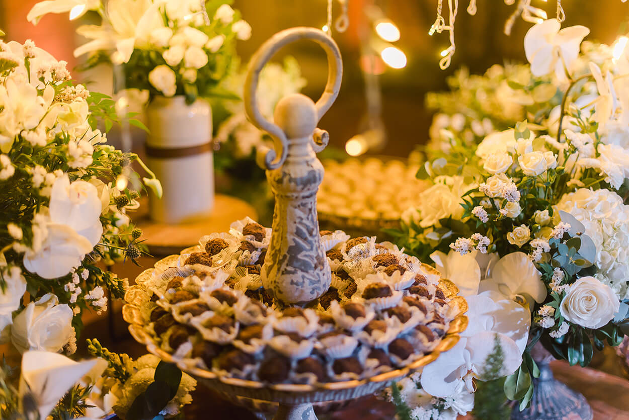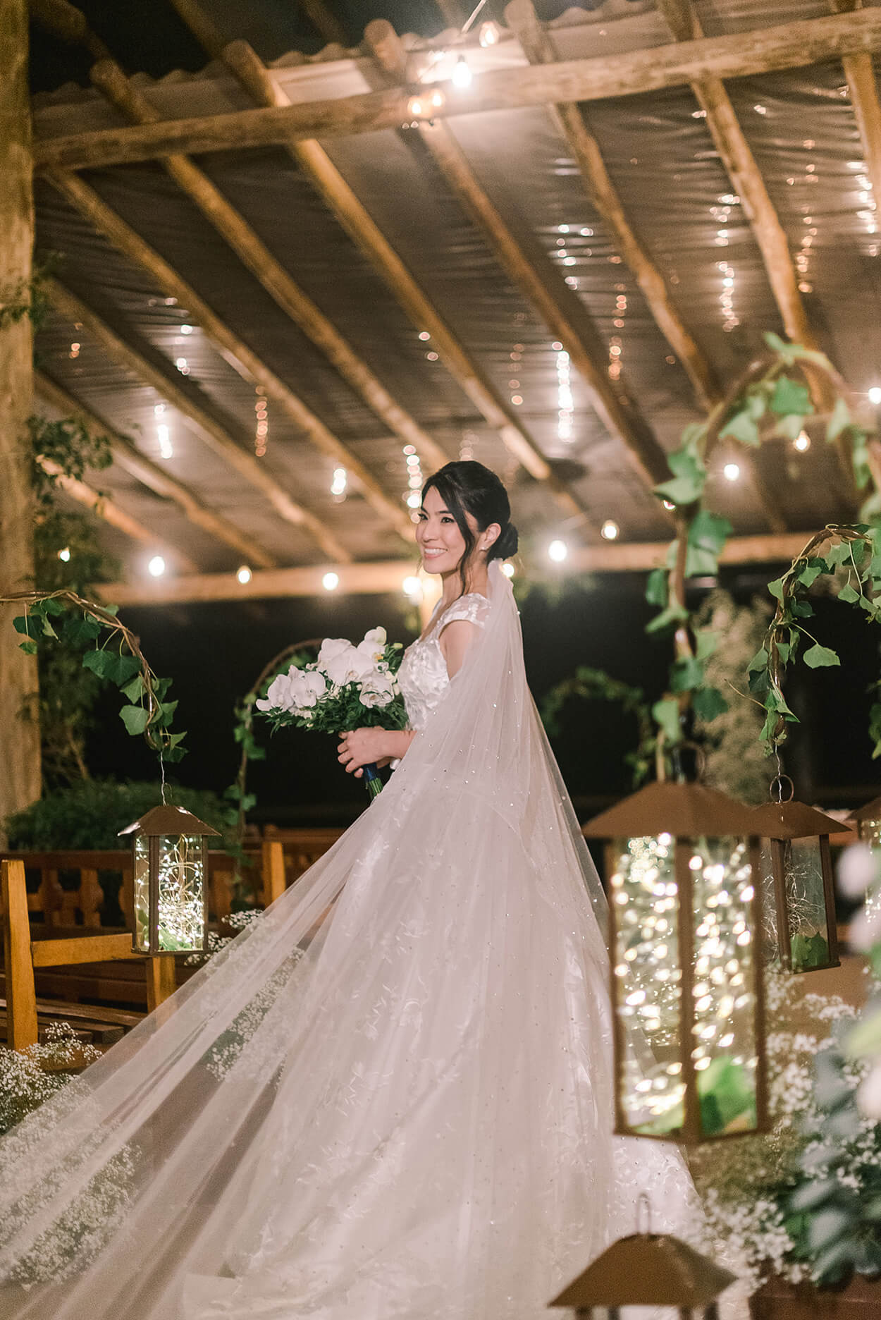 Não é a toa que a dupla é um clássico! Essa paleta de cores fica perfeita tanto em cerimônias em salões, quanto em espaços ao ar livre. E faz tempo que a flor mosquitinho voltou com tudo, sabia? Para finalizar com clima de conto de fadas, o caminho da noiva contou com lindas luminárias cheias de luzinhas no estilo fairy light.