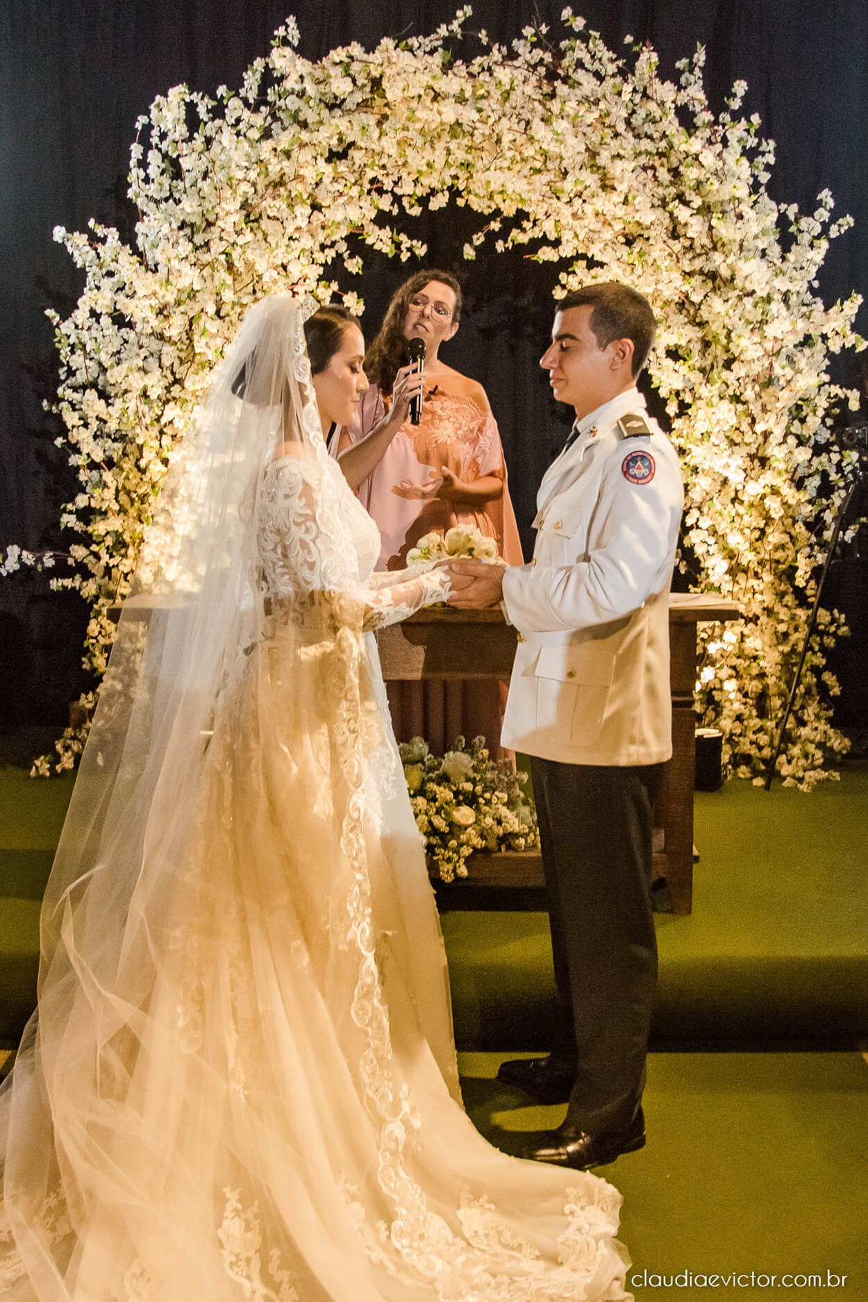 Geralmente os noivos escolhem um ritual de casamento por conta do seu simbolismo, mas como esse é um enlace oficial, o cortejo é um pouco diferente. Os oficiais convidados fazem a guarda de honra, que é a “escolta” da noiva até o altar. E no final, os noivos saem com a proteção chamada de teto de aço.