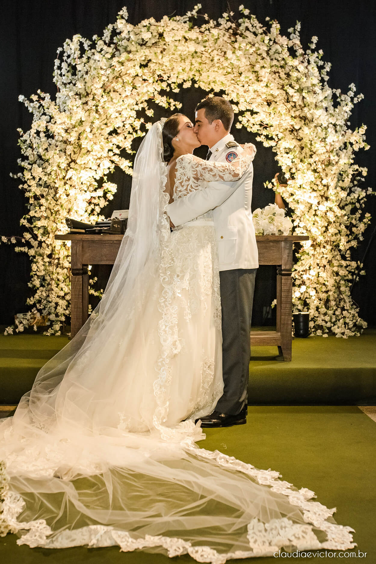 Geralmente os noivos escolhem um ritual de casamento por conta do seu simbolismo, mas como esse é um enlace oficial, o cortejo é um pouco diferente. Os oficiais convidados fazem a guarda de honra, que é a “escolta” da noiva até o altar. E no final, os noivos saem com a proteção chamada de teto de aço.