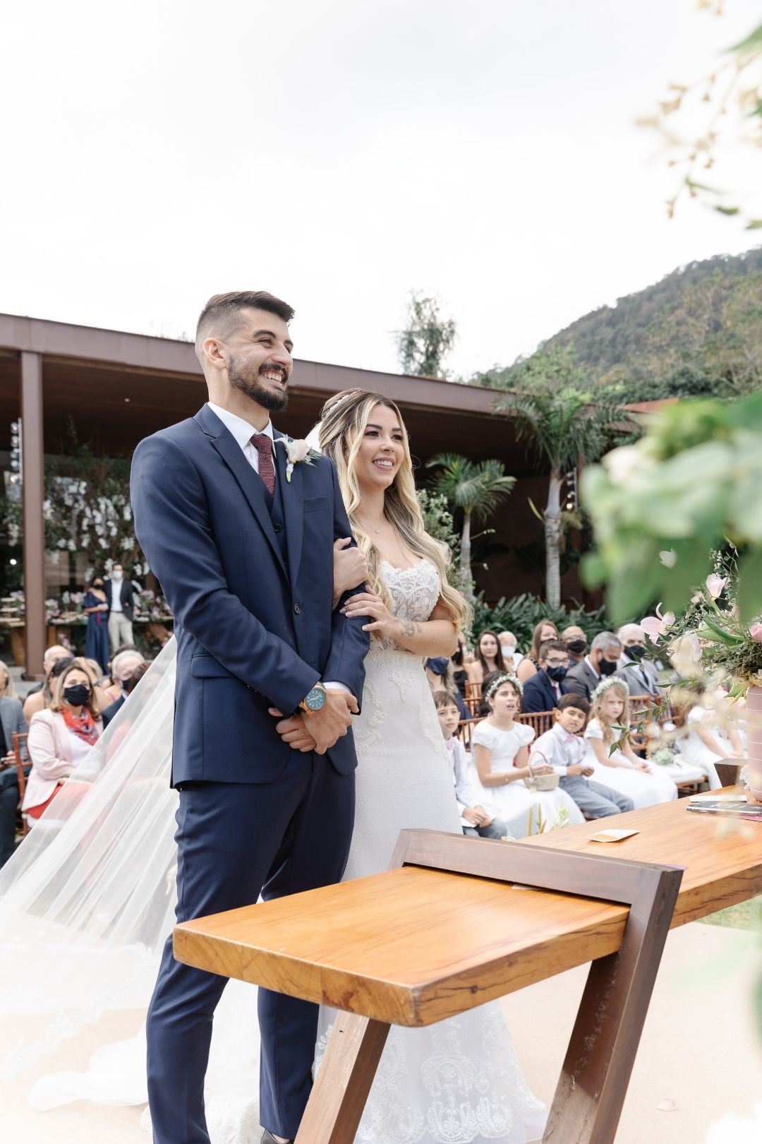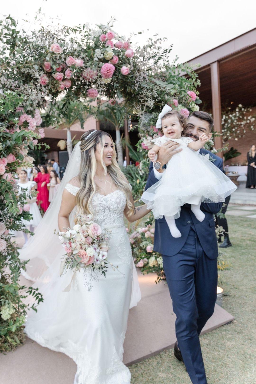 “Após cinco anos juntos o Ricardo me pediu em casamento com um lindo pedido, do jeito que sempre sonhei e eu nem desconfiei de nada. Marcamos o casamento para o ano seguinte mas não contávamos que teríamos uma surpresinha, Luísa! Nossa filhinha e logo após descobrir a gravidez veio a pandemia. Então só nos casamento praticamente dois anos após o pedido”.
