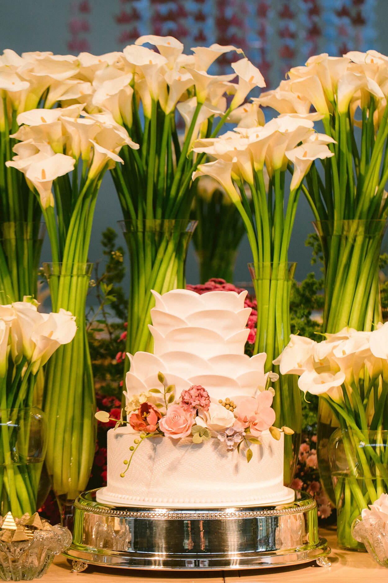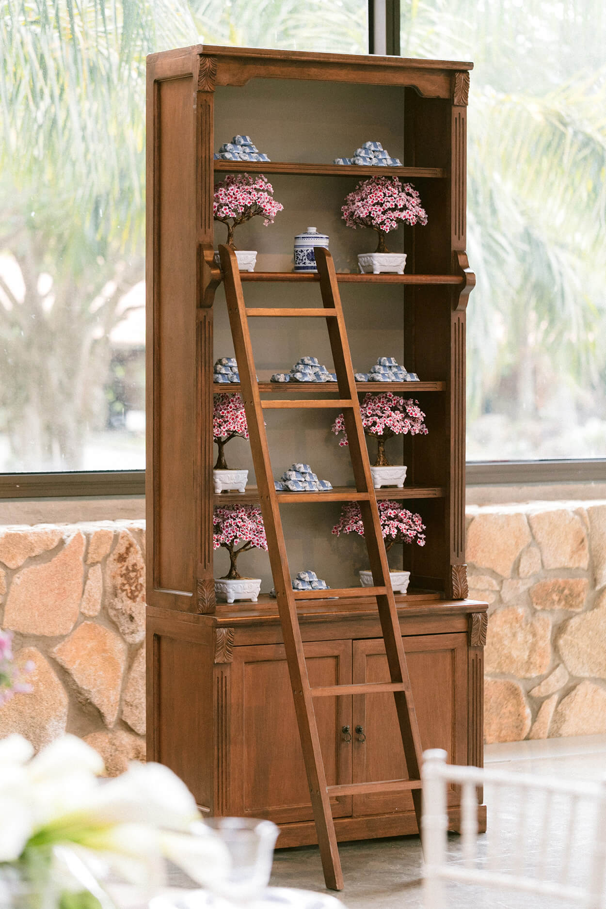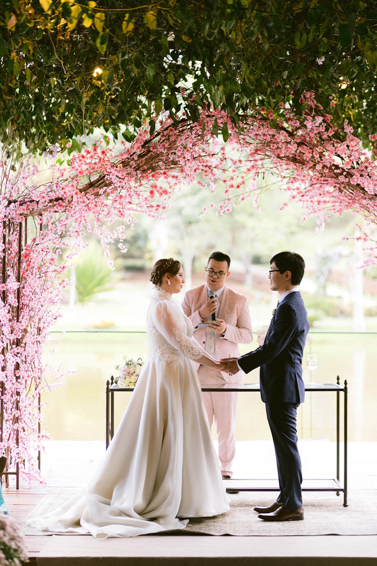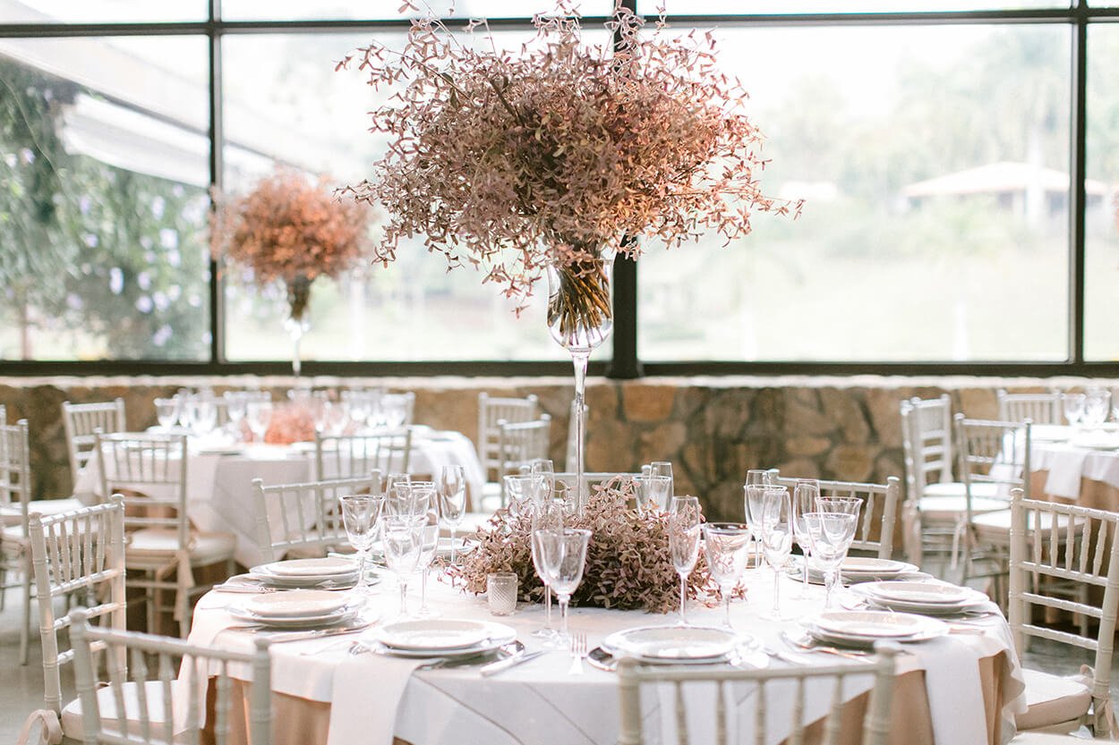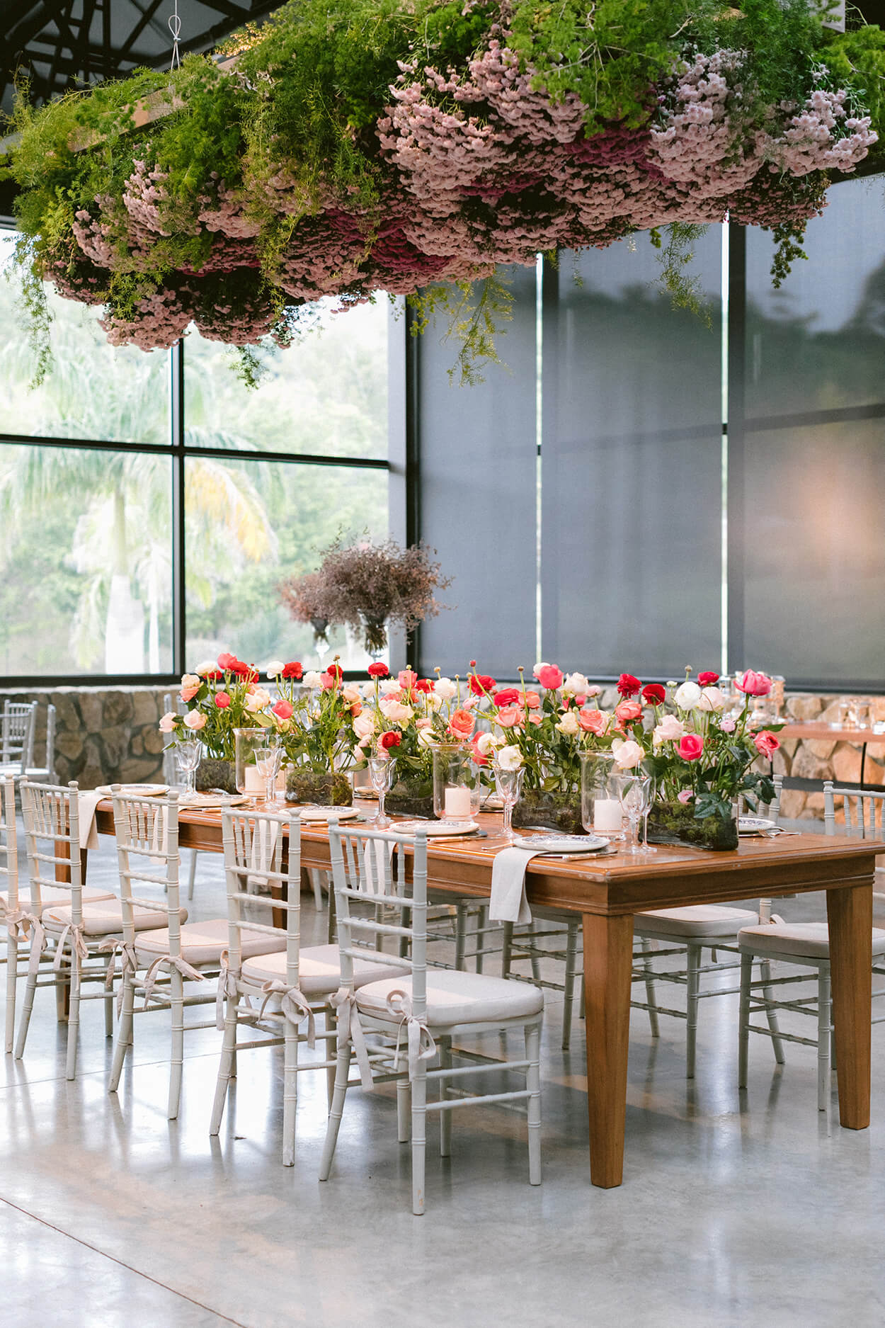 No caminho da noiva, jardineiras com blocos de flores em três tons de rosa que mais pareciam um jardim encantado, e no altar, os imponentes gazebos com cerejeiras. Já no salão, terrários de rosas e ranúnculos enfeitavam as mesas, além de grandes floreiras aéreas que trouxeram uma atmosfera super romântica que a Carla tanto queria.