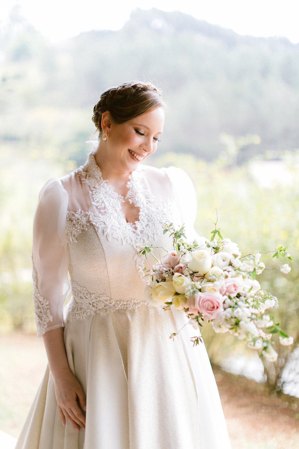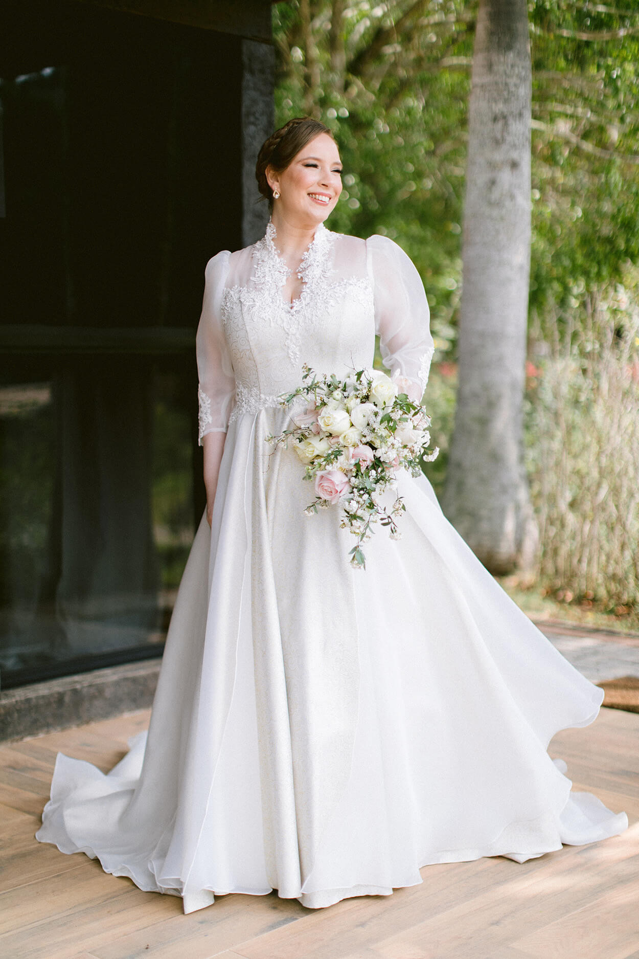 O buquê em formato cascata arrematou o look com o vestido de mangas 3/4.