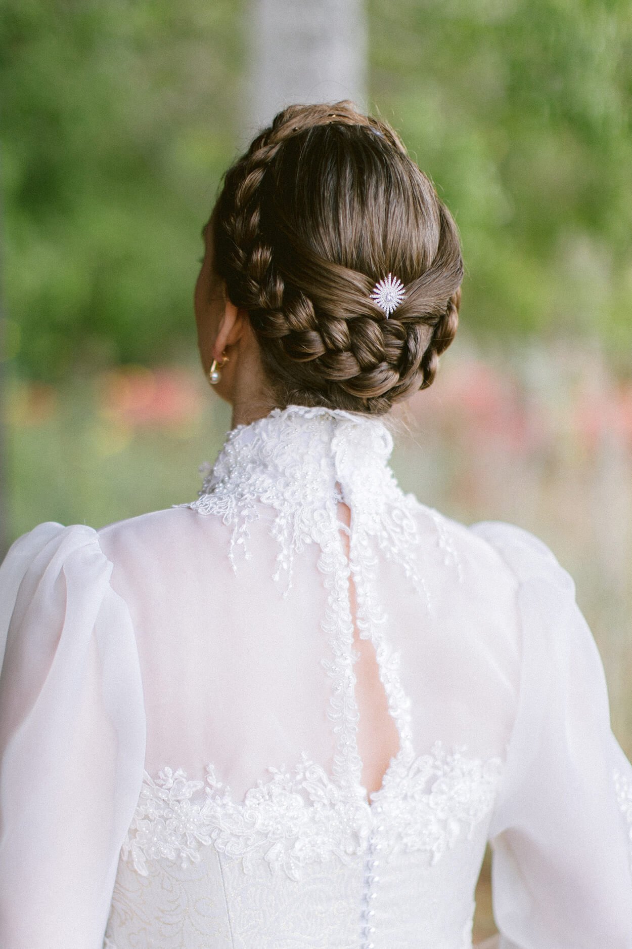 A beleza trouxe uma make bem iluminada e natural – perfeita para casamentos diurnos – e um penteado com tranças combinado com assessório delicado que trouxe um ponto de brilho.