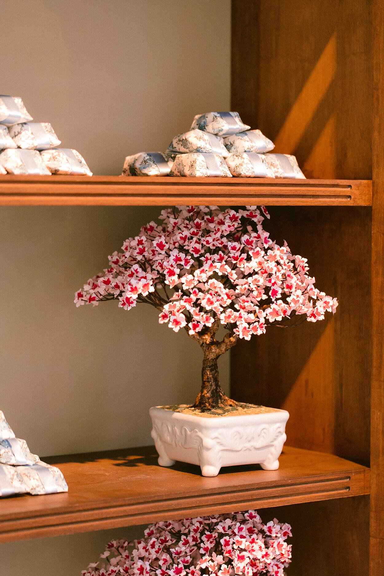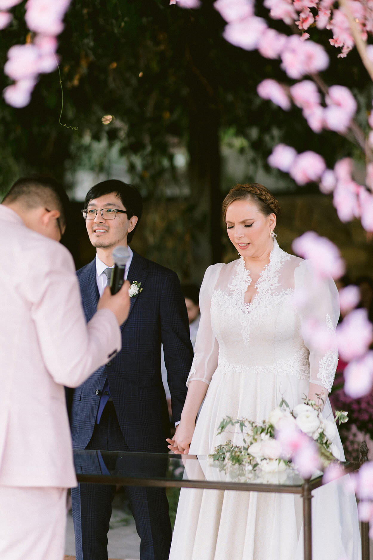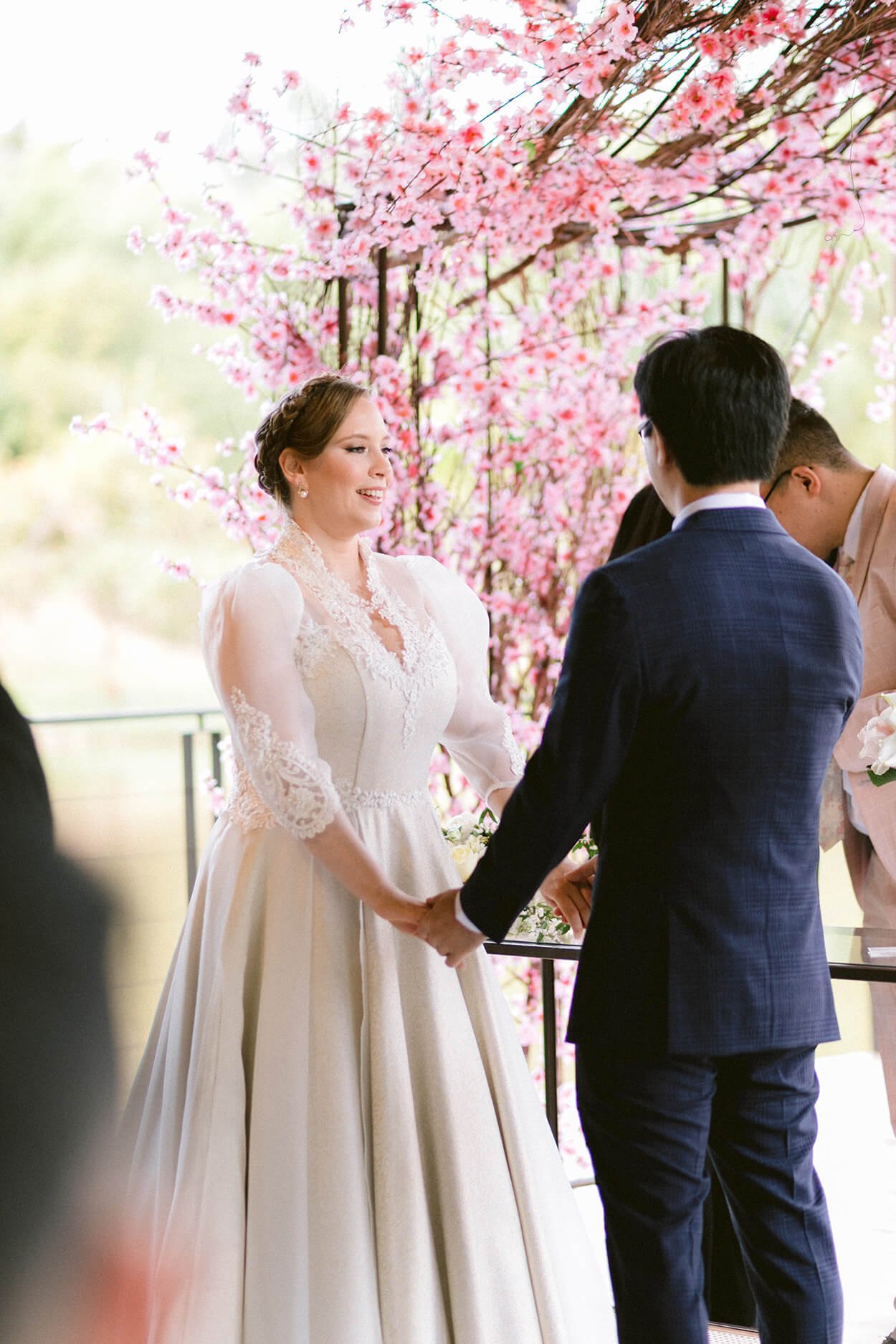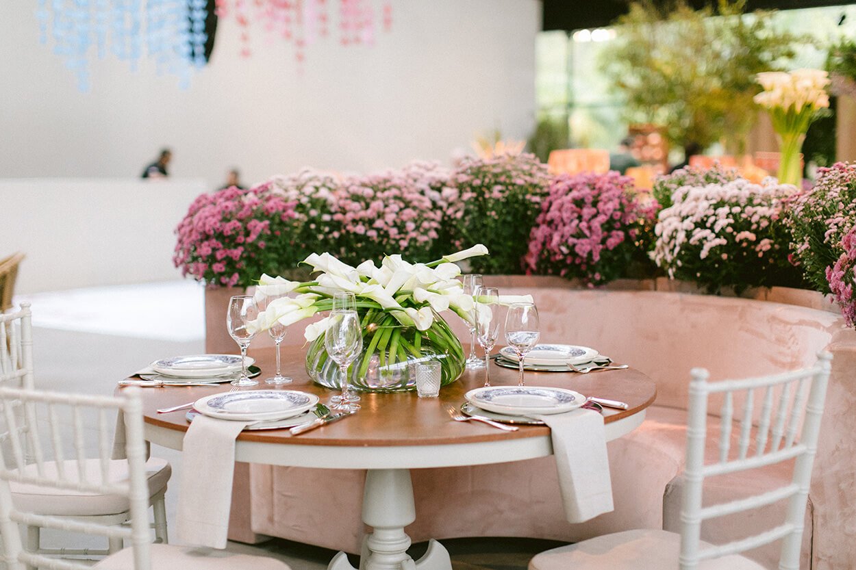 O projeto de decoração nasceu a partir do desejo dos noivos em incluir sua flor favorita no casamento: a cerejeira. A partir daí foi criado toda a proposta do grande dia seguindo uma paleta de cores em tons de rosa (cor preferida da noiva), azul e branco.