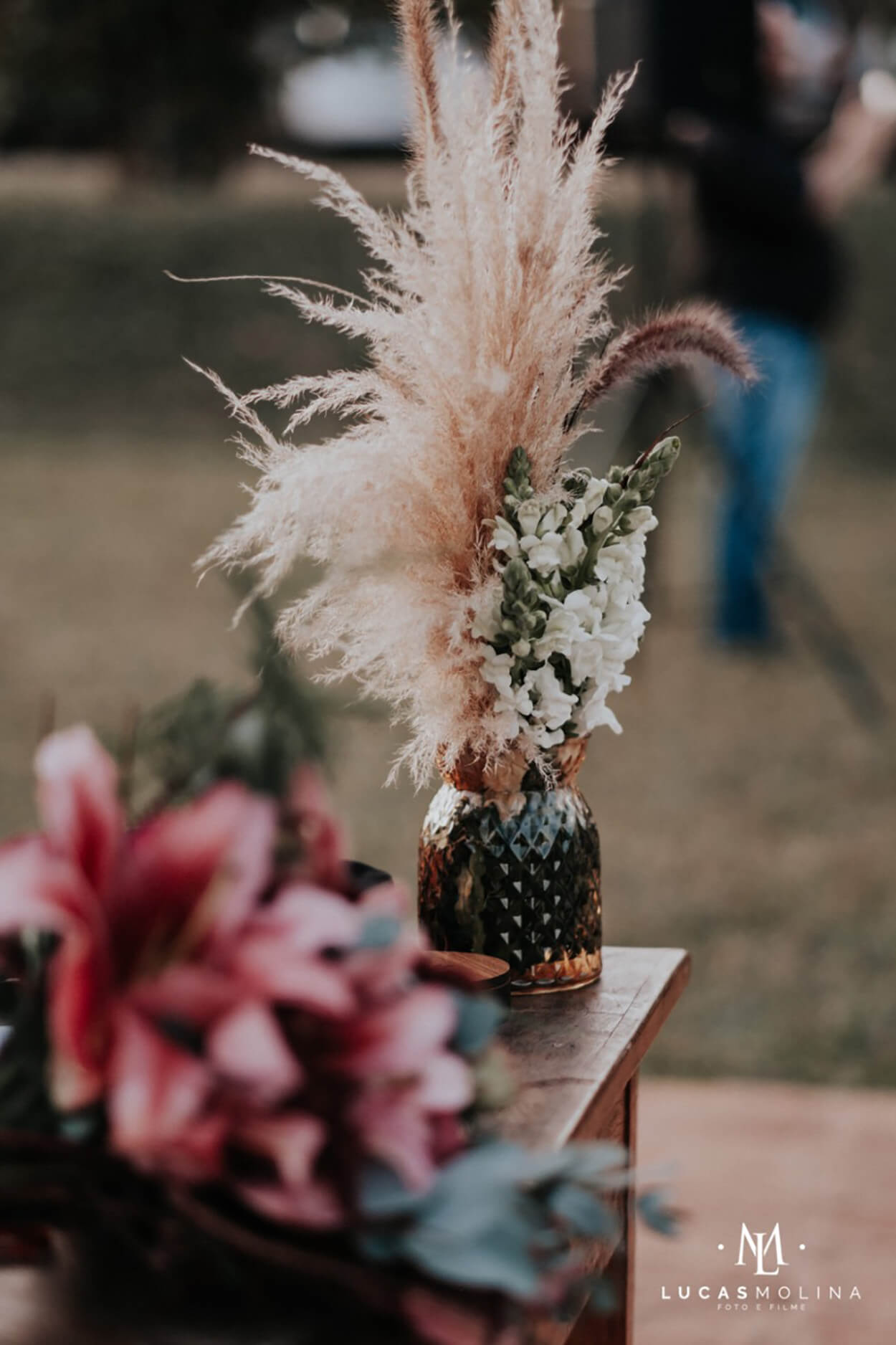 Em primeiro lugar, para aflorar o clima romântico e dar aquele toque boho, a decor investiu na composição floral. Claro que não poderia faltar as flores secas e o capim dos pampas que nós tanto amamos!