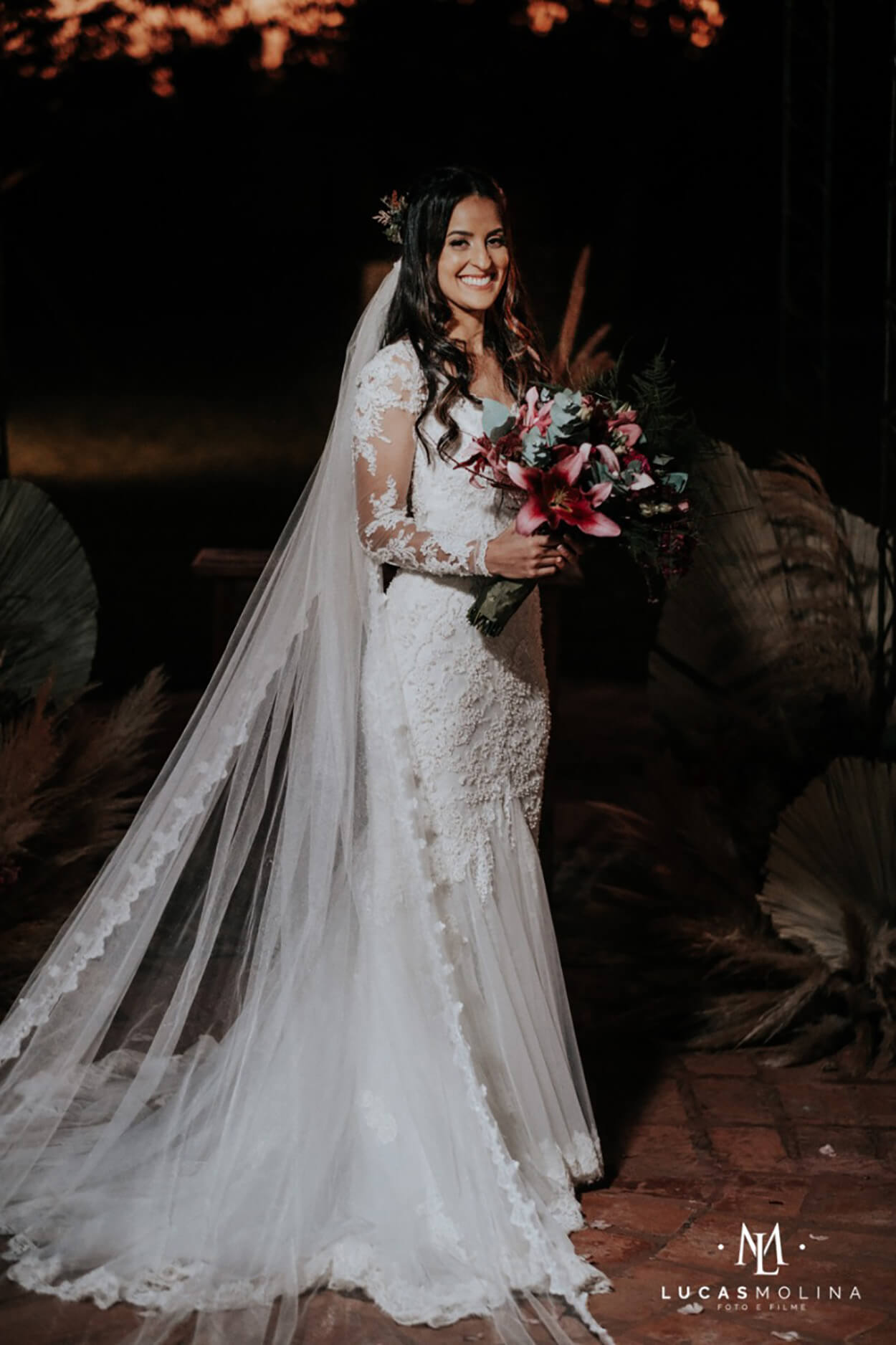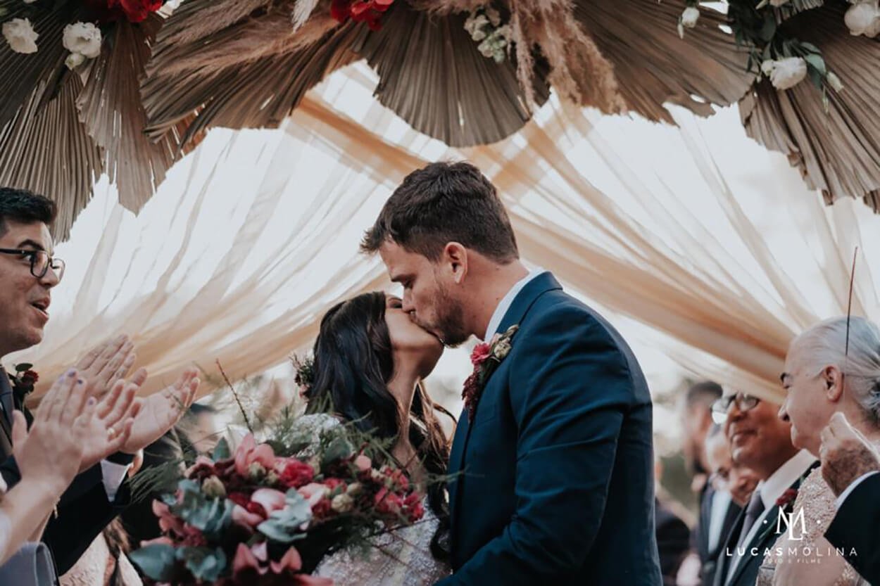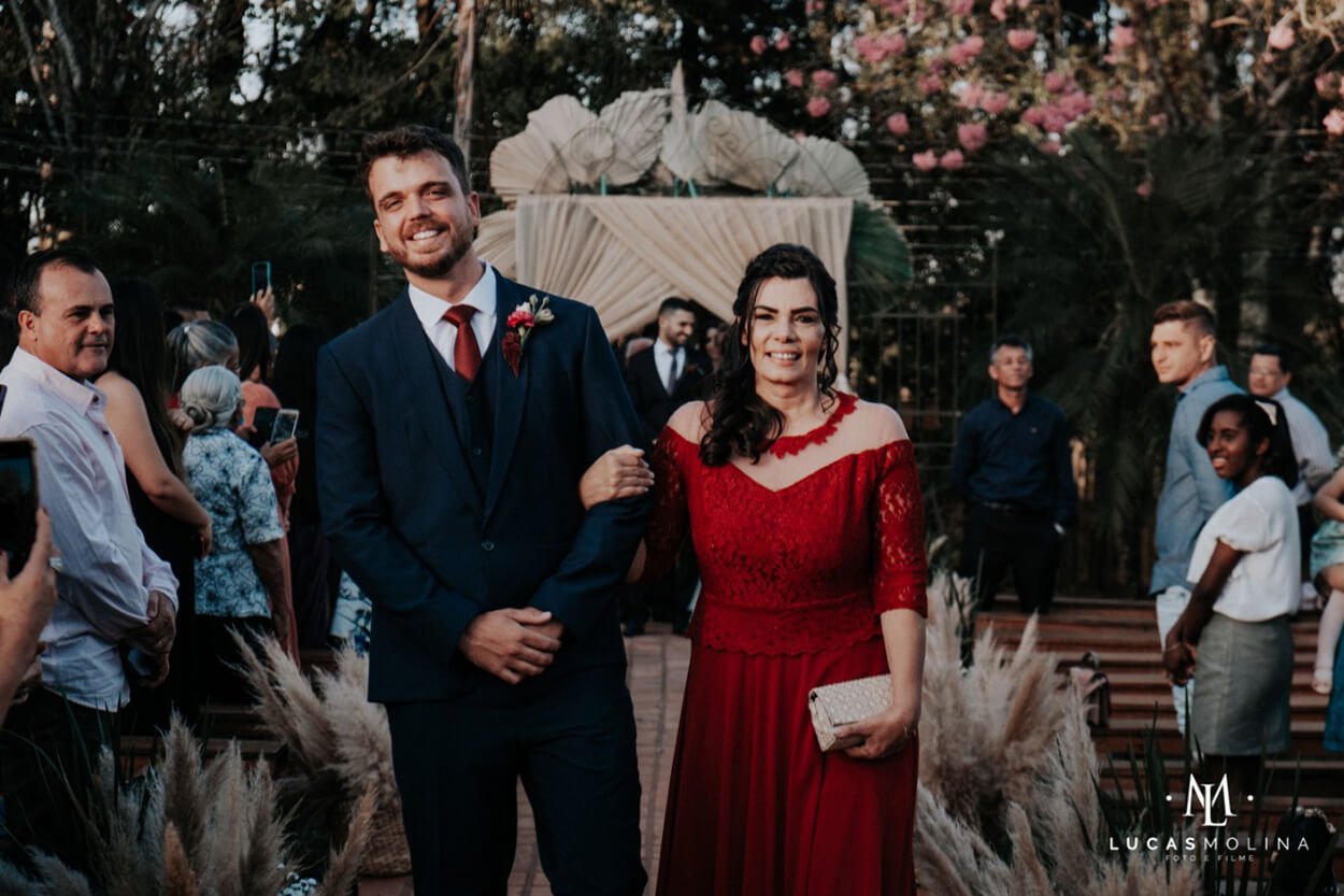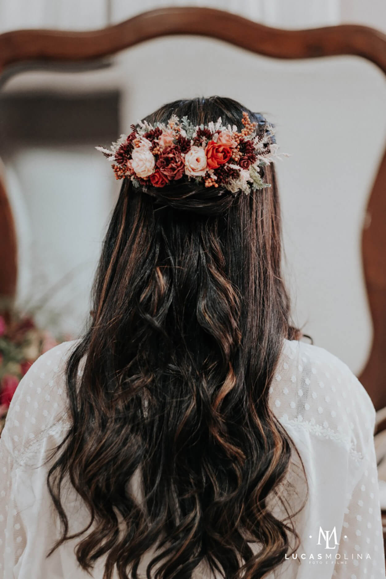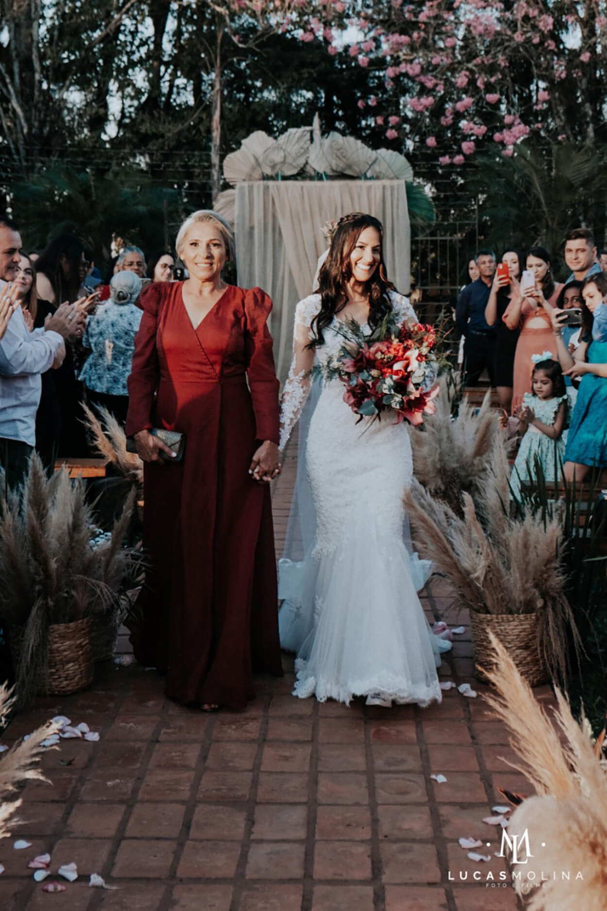Você pode notar o marsala presente em alguns pontos de cor na decor. Nas flores do cabelo da noiva e até na gravata do noivo. Notaram que as mães dos noivos também vieram vestidas com esse lida cor? O visual ficou poderoso e elegante na medida certa.