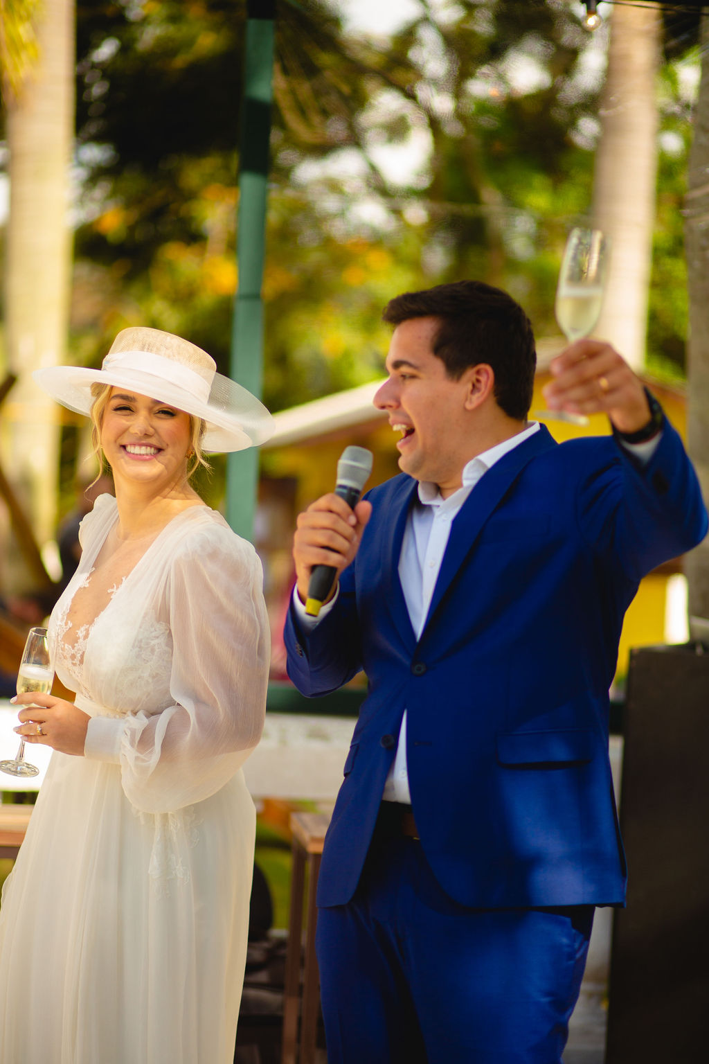 A noiva estava deslumbrante com o vestido que uniu delicadeza e leveza que combina perfeitamente com um casamento no campo. Para completar o look, o chapéu trouxe personalidade ao visual que arrancou elogios dos convidados.
