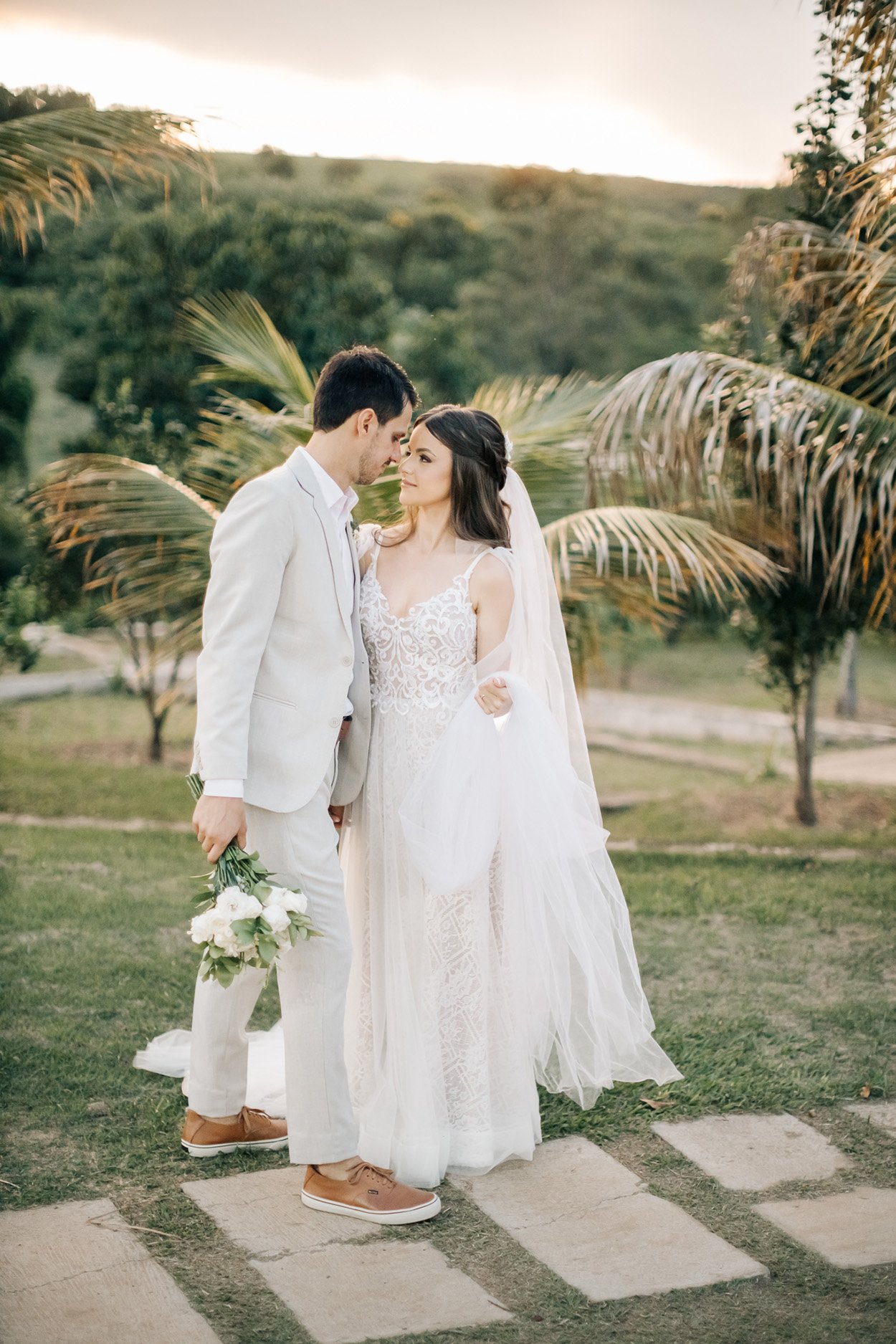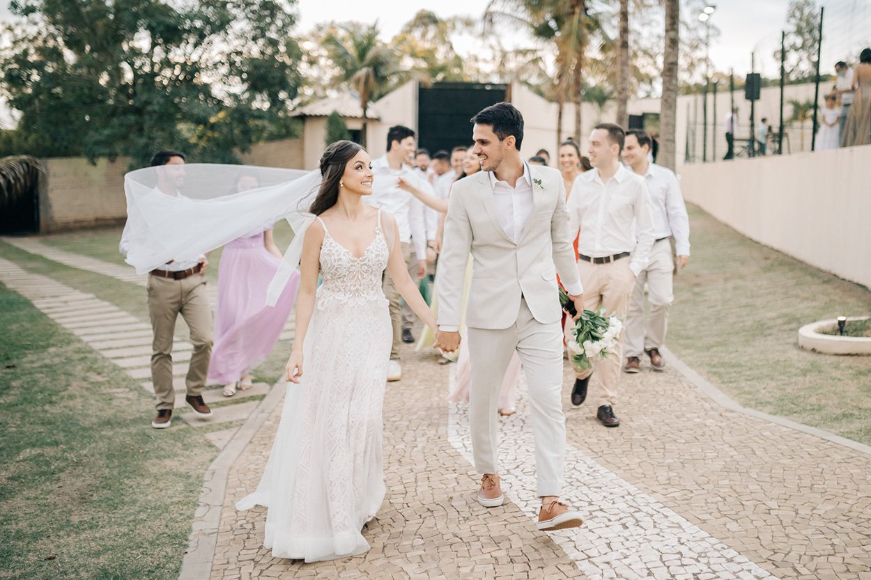 Para harmonizar com o ambiente no campo, o noivo optou por um paletó cinza claro combinado com tênis e cinto marrom. Ana não abriu mão de usar um longo véu e grinalda, e ainda apostou em um modelo com personalidade.