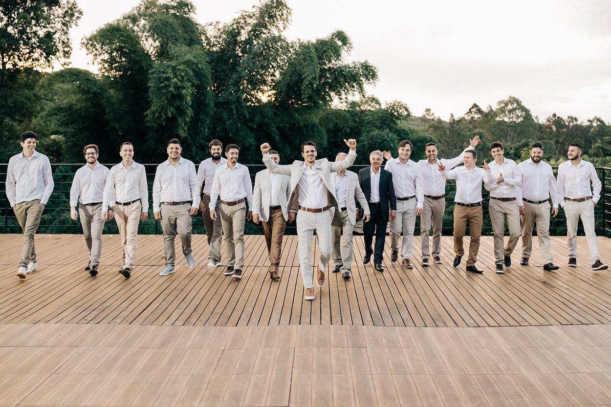 Noivo e padrinhos ganharam um visual igualmente elegante ao do noivo. Enquanto as madrinhas tiveram mais liberdade com as cores, misturando tons pastel com tons mais profundos.
