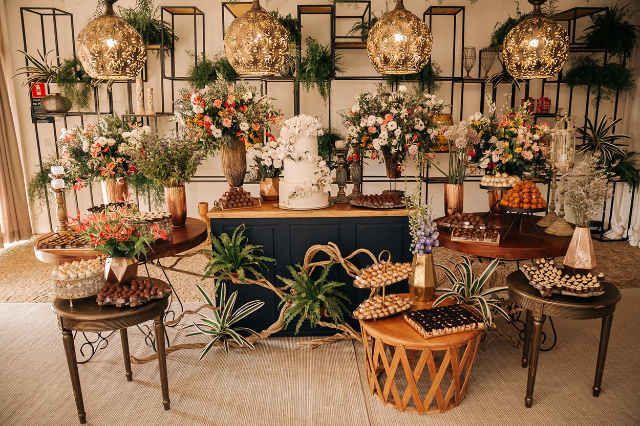 A decoração explorou uma paleta leve, branca, verde e com detalhes em amarelo e dourado. Brincou com as cores e formas dos arranjos e, é claro, o bolo roubou a cena. Há quem prefira um topo de bolo mais discreto, mas esse é a prova de que produções maxi também aceleram o nosso coração!