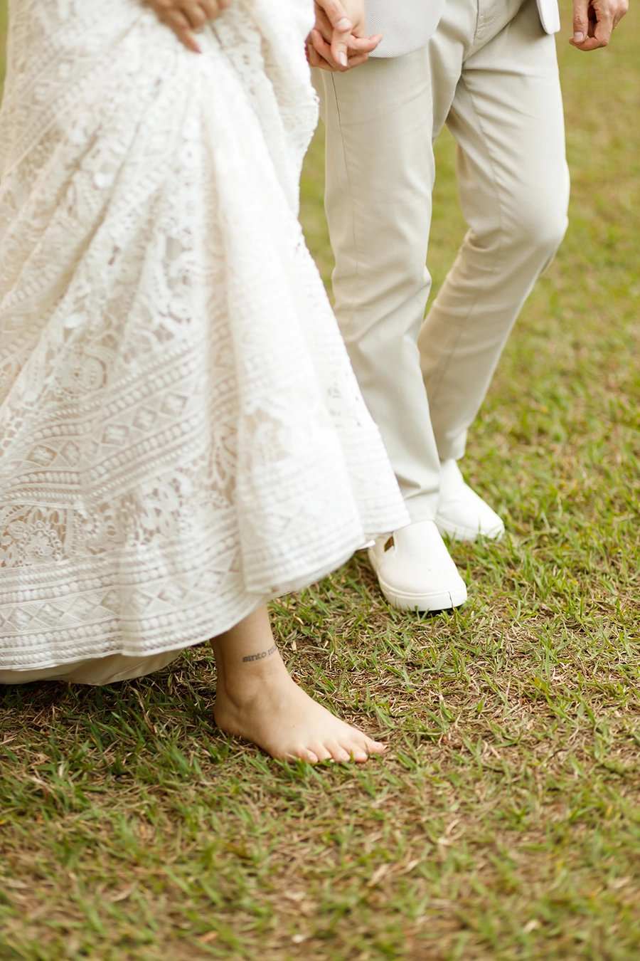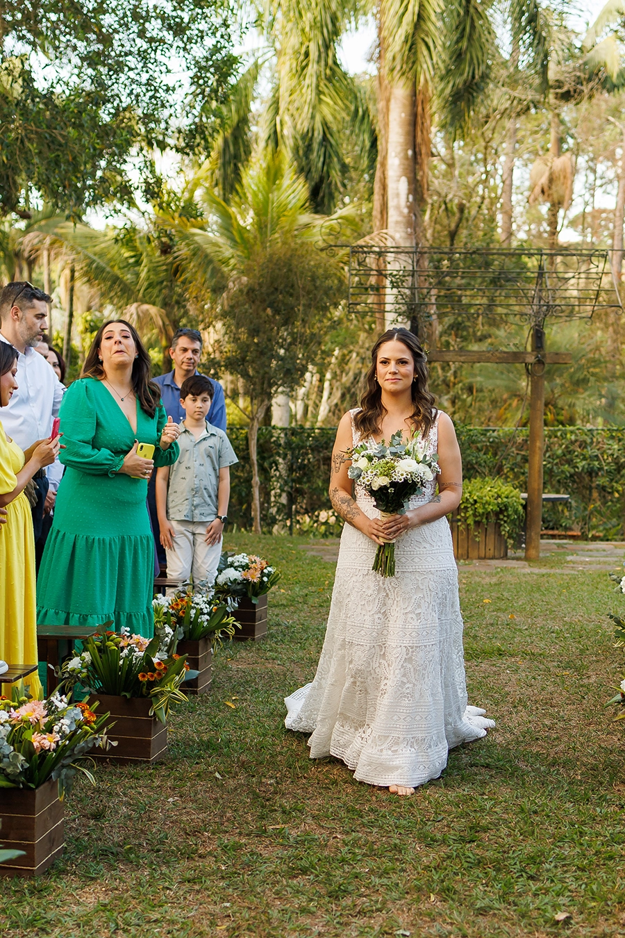 Eu entrei descalça e algumas pessoas (que não foram convidadas) comentaram; era meu sonho casar num gramado descalça, pra mim foi perfeito e eu fiquei muito feliz.