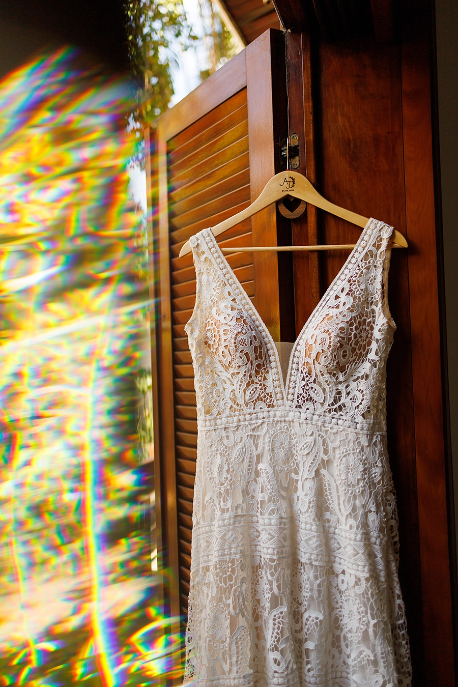 As lembrancinhas foram sacolas ecológicas em algodão cru, nas quais um artista local pintou a mão as palavras: recicle, adote e preserve. O casal colheu pimentas rosa do pé, peneiraram e colocaram nos saquinhos de linho para substituir a tradicional chuva de arroz, evitando qualquer dano aos pássaros da região.