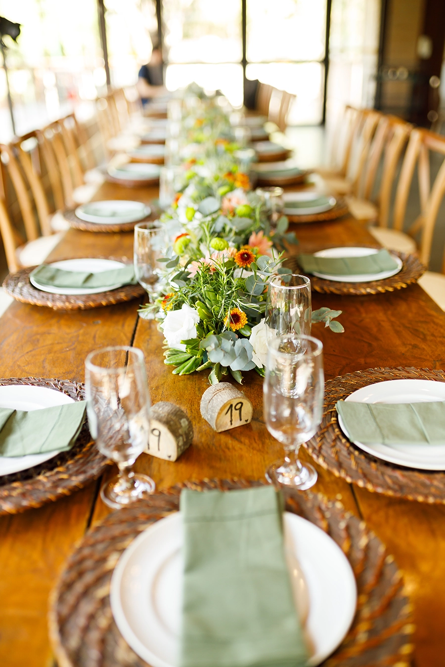 Tiveram acesso á alguns galhos de árvore que seriam triturados e dispensados, e deles fizeram pequenos toquinhos que serviram para identificação da numeração das mesas. A decoração seguiu a paleta de cores em tons terrosos, verde e branco…Amamos o altar circular da cerimônia!