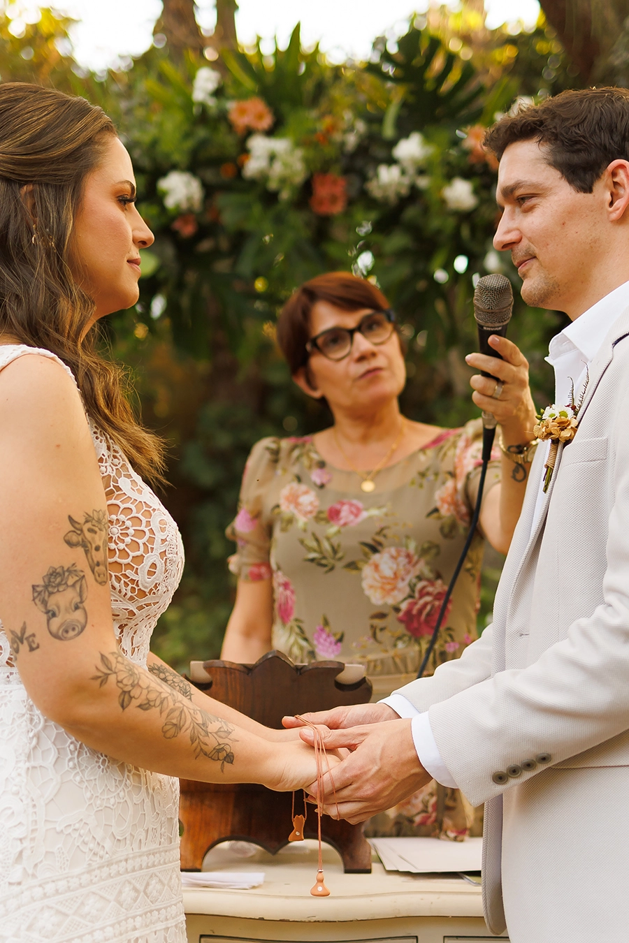 Após uma semana meio chuvosa, amanheceu um dia lindo, um céu azul pintado a mão. Mas Deus é muito mais do que a gente sonha ou espera; ele tinha um presente ainda mais maravilhoso pra nós. Escrevo essa parte com lágrimas nos olhos ao lembrar desse momento: logo após minha entrada na cerimônia, a celebrante falava algo e de repente eu ouvi; o piado de um tucano. Ele estava lá, na árvore, bem acima de nós. Eu só sabia chorar, olhei para o João e falei ‘você está ouvindo?’, olhei pra minha mãe e perguntei a mesma coisa.