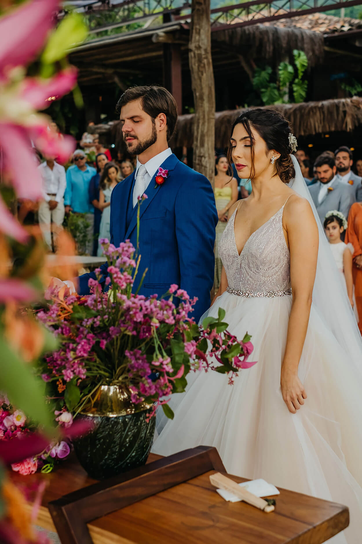 A Gabriela e o Renan queriam um casamento na praia, mas com um estilo elegante e sofisticado. Tudo isso em tons alegres entre o coral, alaranjado até o pink.