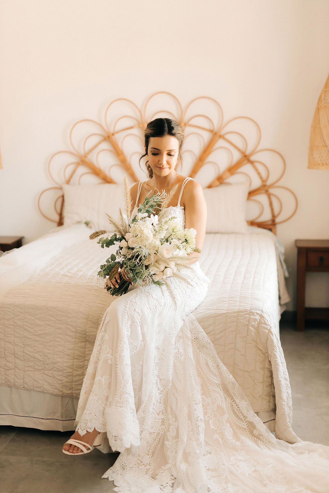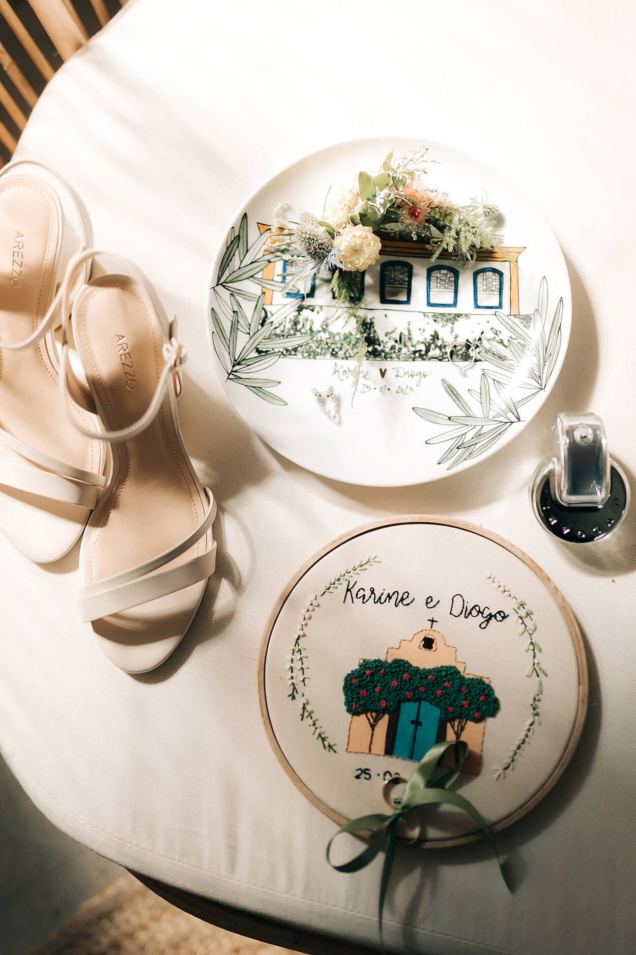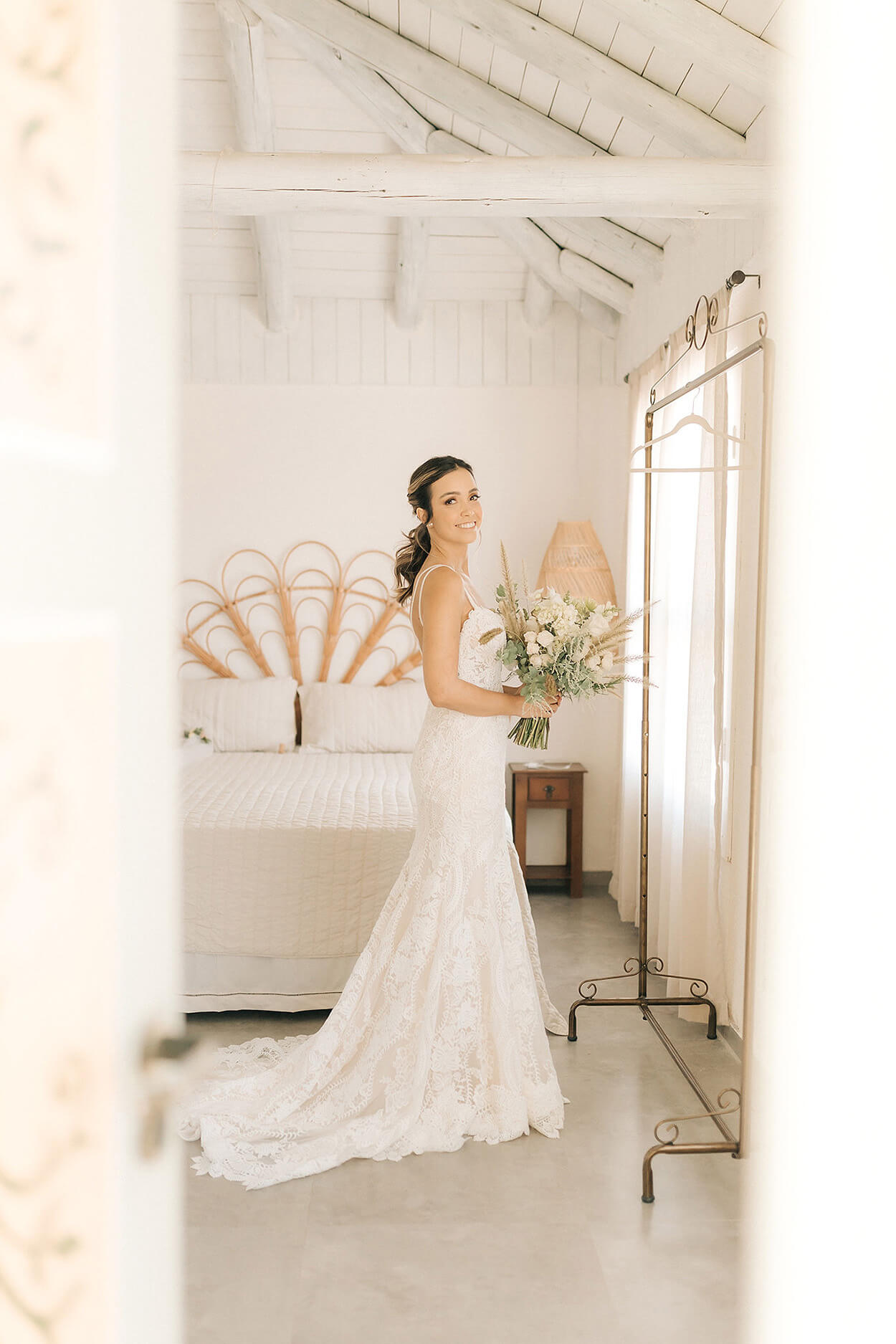 Karine apostou em um visual marcado pela suavidade. O vestido semi sereia destaca a silhueta e também colo. Por esse motivo, a noiva escolheu um penteado preso com torcidinhos nas laterais.