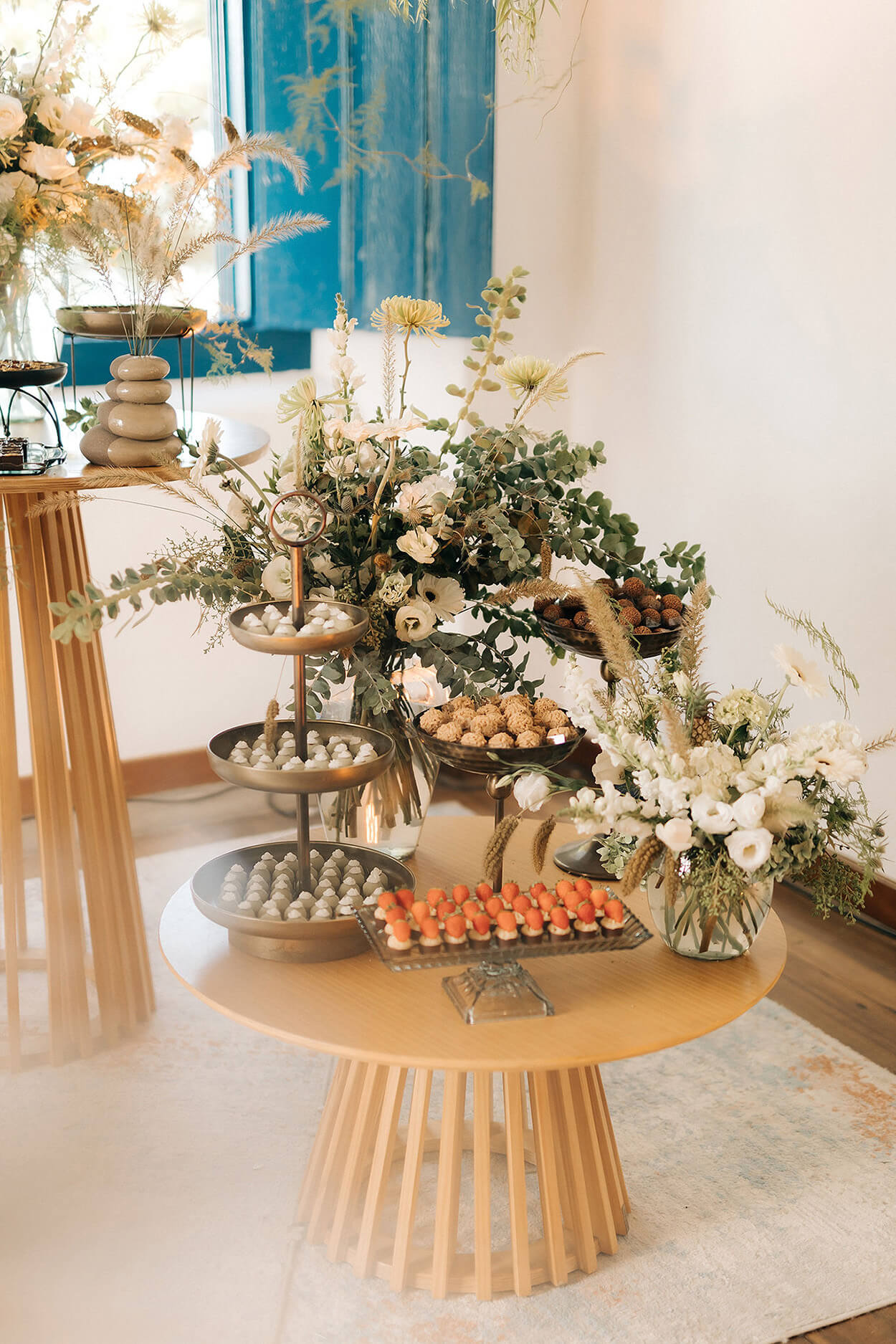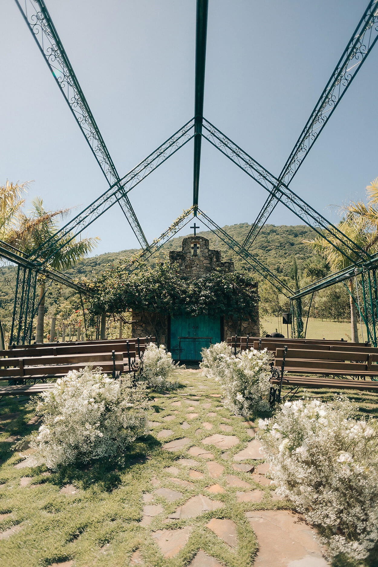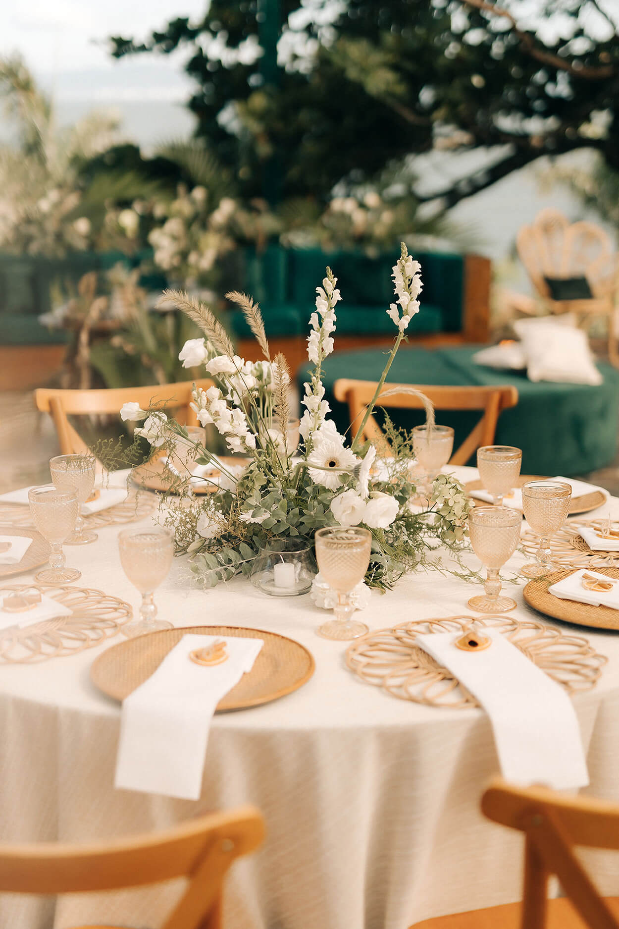 Vamos combinar que essa dupla é sensacional e nunca falha! Antes de tudo, o ambiente oferece uma capela de cristal para a cerimônia e também um salão com cobertura para o plano, então o grande truque está em saber utilizar esse elementos a favor da decoração. Como as estruturas são verdes, nada melhor do que construir uma paleta com essa cor acompanhada de tons neutros.