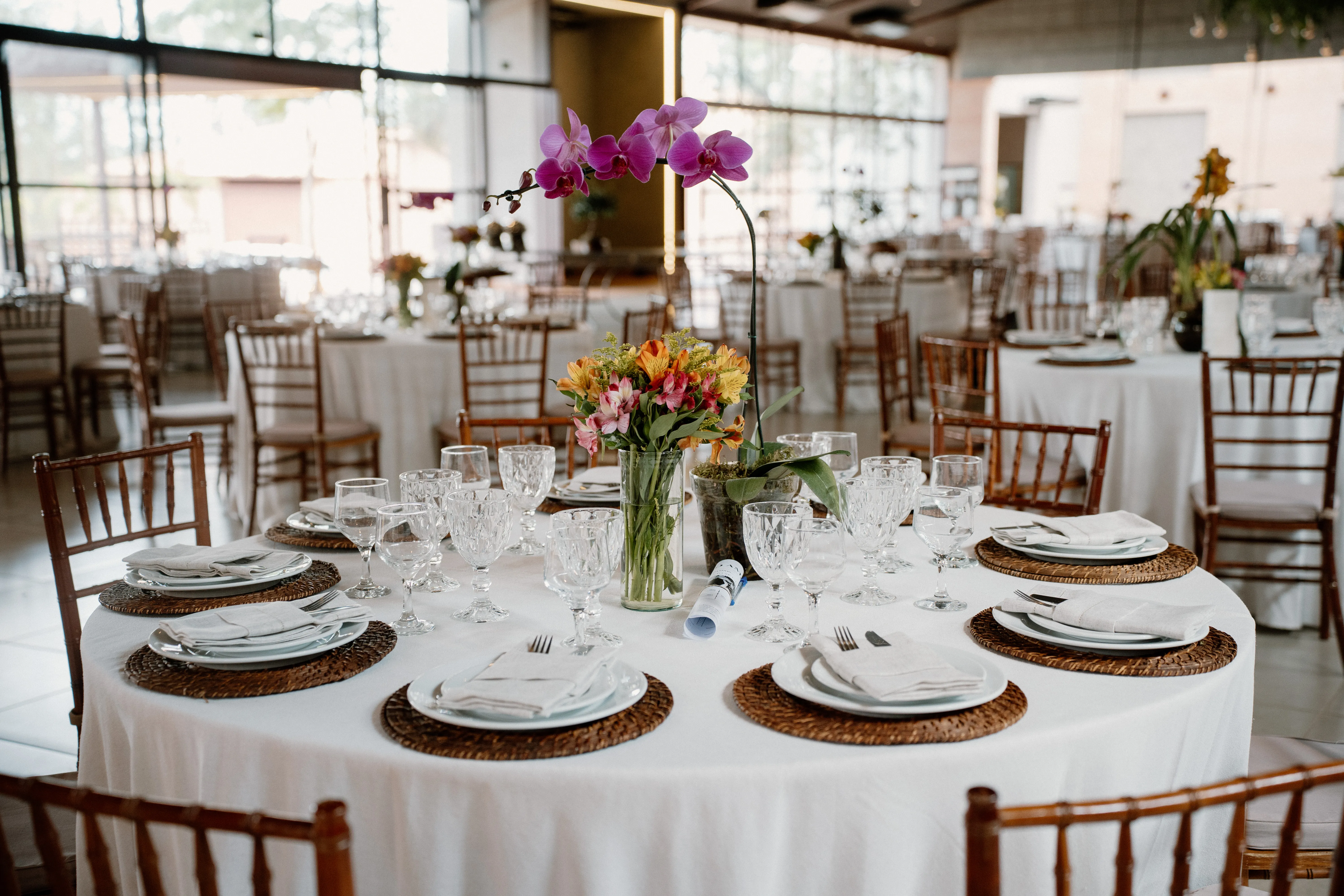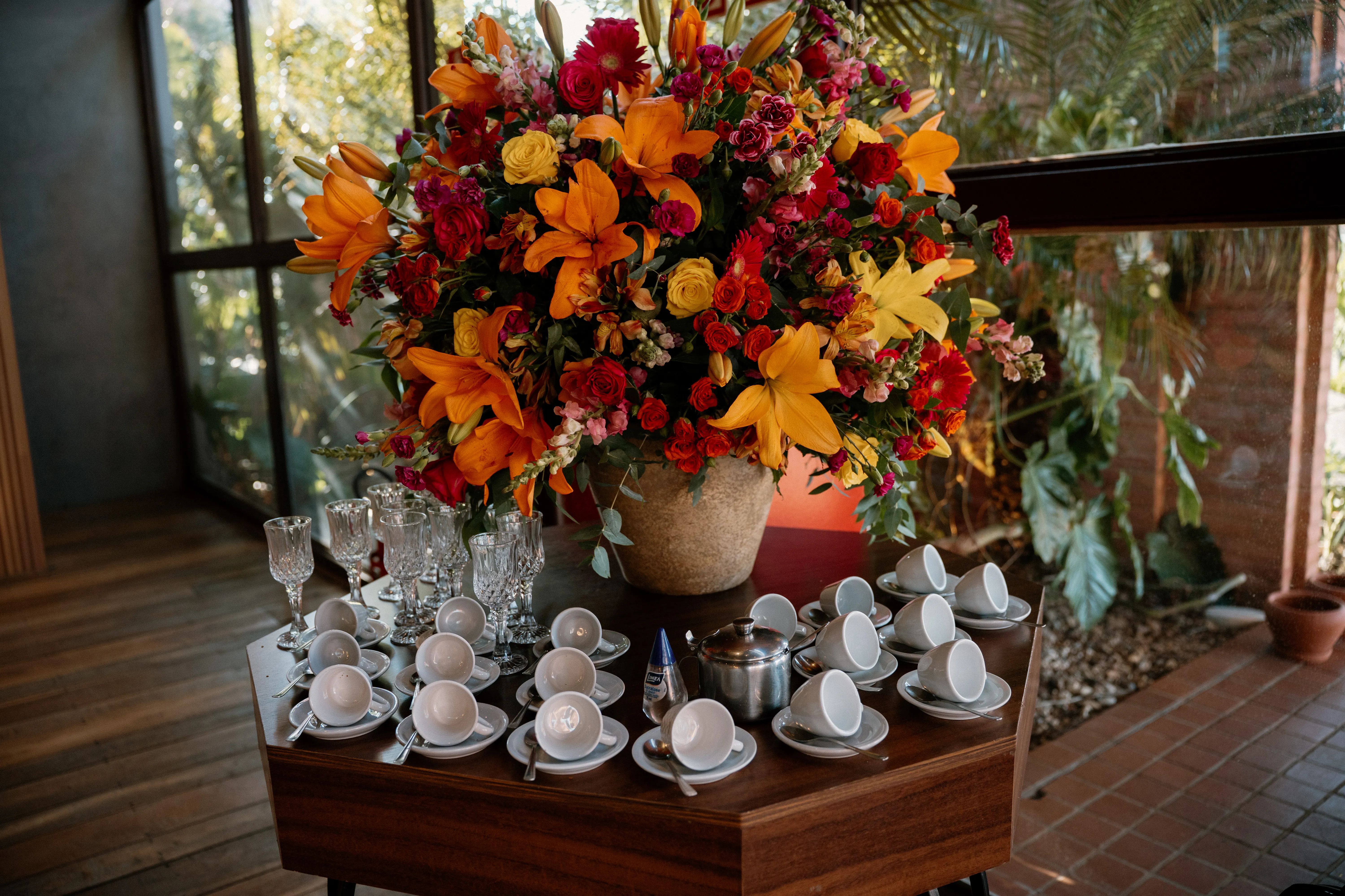 A decoração tropical trouxe vida e movimento ao espaço, com flores vibrantes, folhagens exuberantes e arranjos cheios de personalidade.