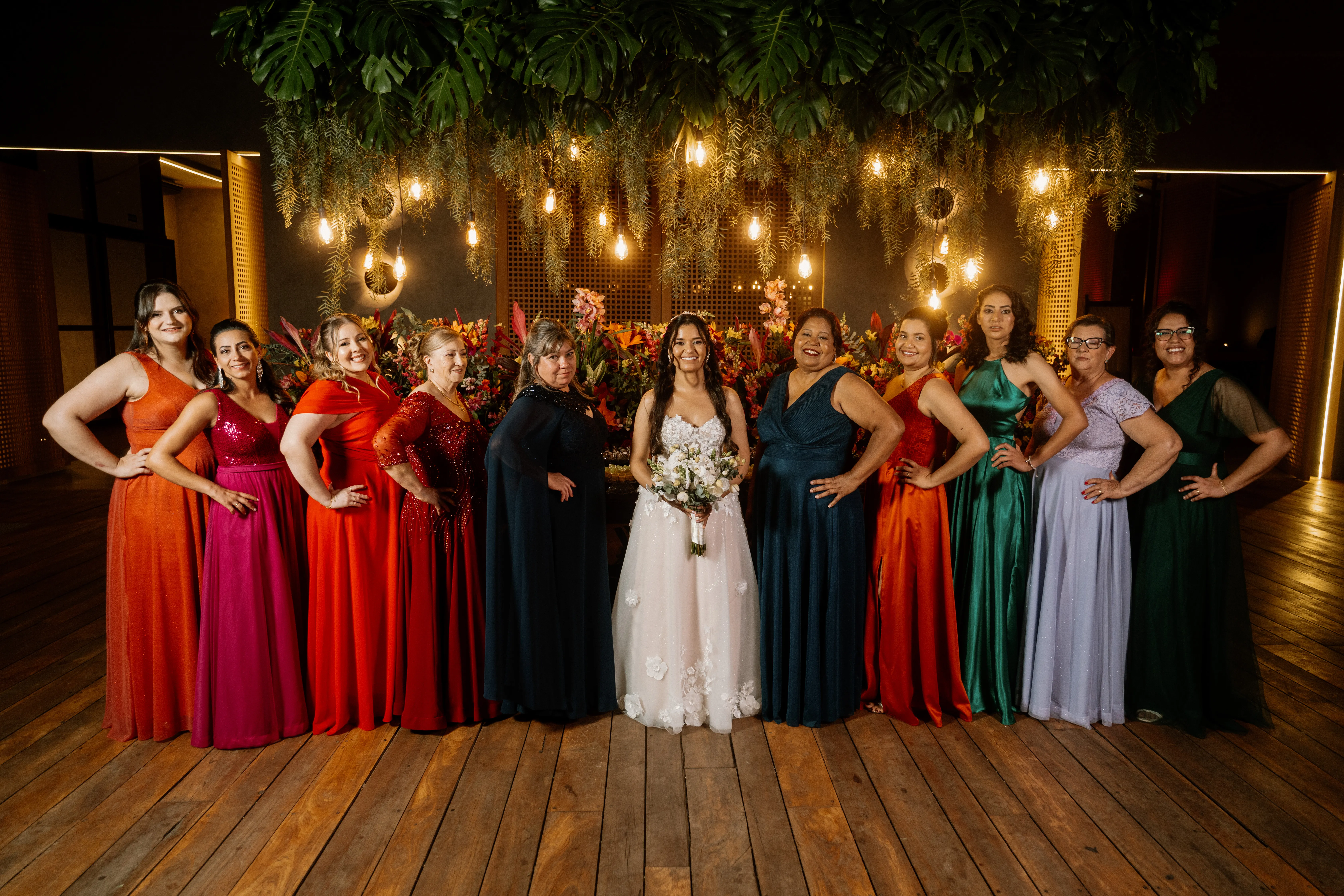 As madrinhas foram convidadas a escolher vestidos em tons alegres, compondo uma paleta espontânea e festiva.