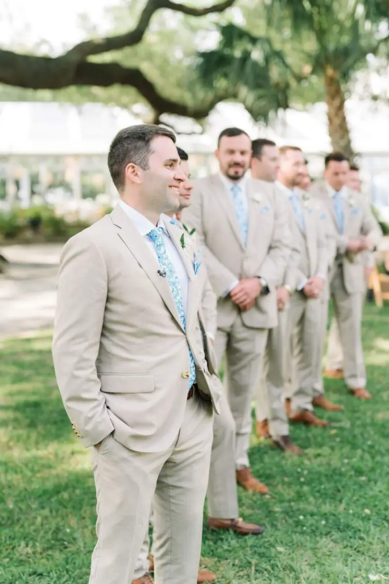 O noivo também pode aderir à tendência. Um terno em bege ou cinza claro combinado com uma gravata ou lenço de bolso em tons pastel adiciona um toque moderno e elegante ao visual.