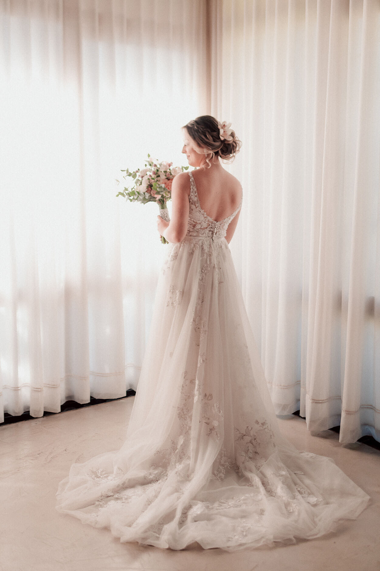 Noiva com robe branco olhando para seu buque com flores brancas e rosas e ramos de eucaliptos