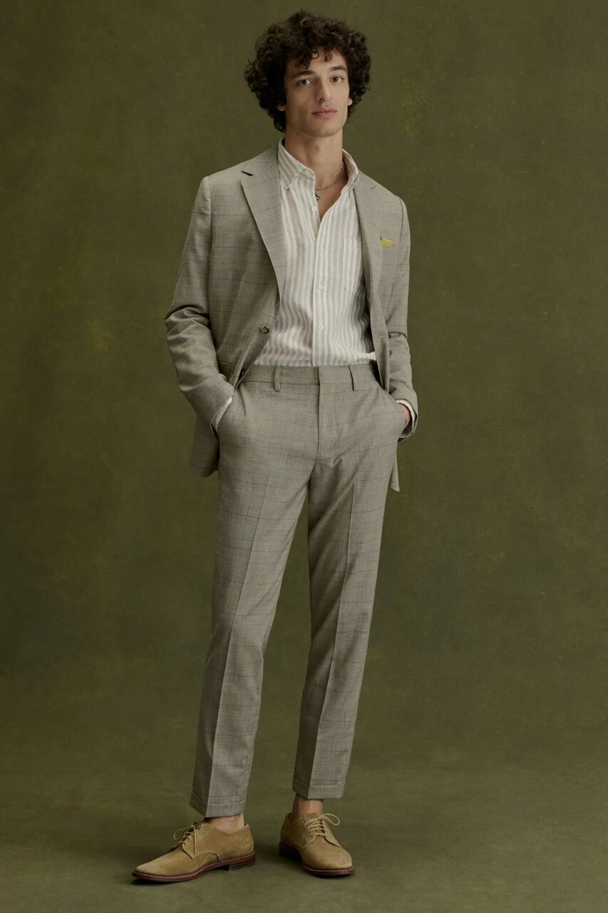 Já para os homens, um terno claro ou uma combinação de blazer com uma calça de alfaiataria, e até uma calça um pouco mais descontraída como em sarja, caem super bem. Ah! E a camisa social pode ser em tons claros e sem o uso da gravata (não é obrigatório). Para completar o look, sapatos sociais estilo derby, brogue, oxford ou também loafers são as opções mais acertadas.