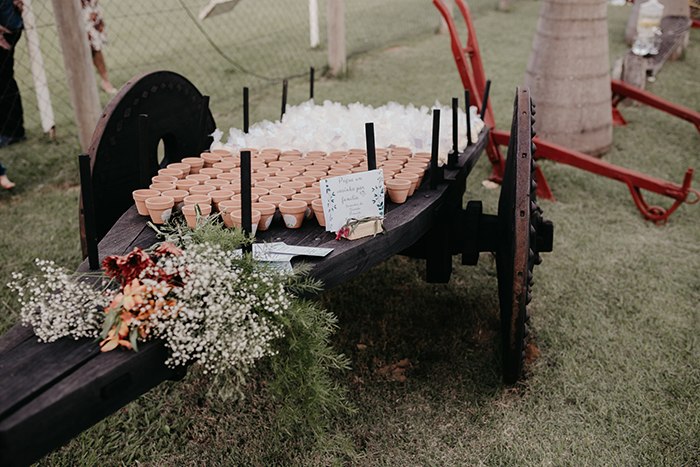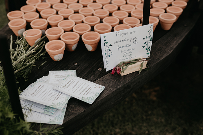 Os vasos de barro foram feitos por outro vizinho que é oleiro. A Rayane juntou garrafas de vidro para os centros de mesa e decorou potes de vidro com tinta e sisal. Os porta guardanapos foram feitos por ela com nós, assim como os saquinhos com as folhas secas para serem jogadas no final. Ela também fez a arte das mensagens nos quadrinhos, cesta de lençóis, banheiros etc. e reaproveitamento de porta retratos quebrados. “Sempre tentamos dá prioridade aos profissionais e artesãos locais, além reaproveitar materiais e gerar pouco resíduos durante e pós casamento.”