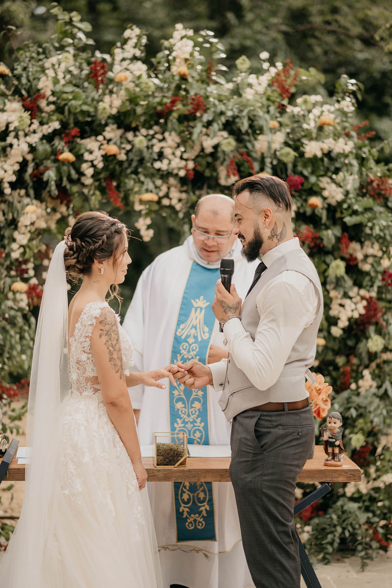 Para os noivos, uma cerimônia clássica nunca foi uma opção. “Saiu um estilo exatamente como sonhamos, folk e com uma mistura de tudo que gostamos”. Além disso, eles fizeram umas três vezes a papelaria, até sair o resultado perfeito.