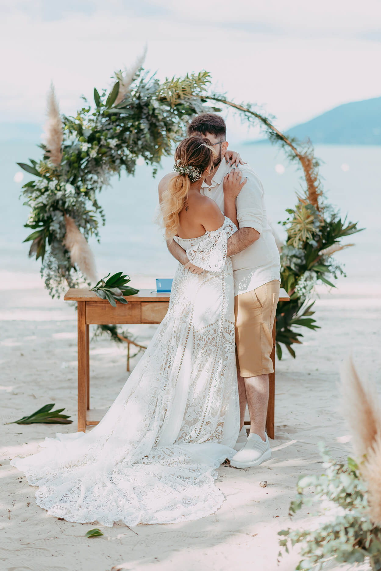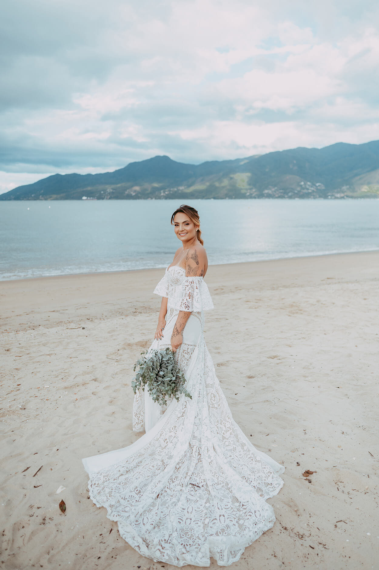 Mas não poderíamos encerrar esse post sem antes falar sobre o buquê! A noiva nos surpreendeu com a escolha de ramos de eucalipto para finalizar o seu visual. E você, o que achou?