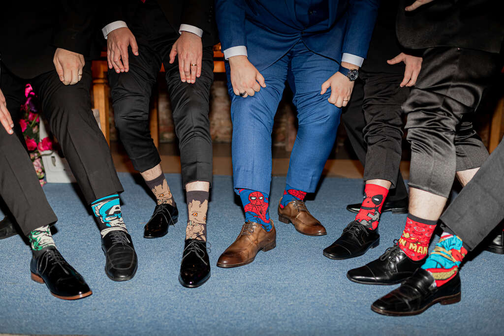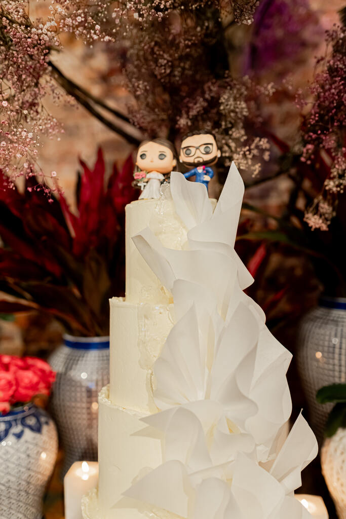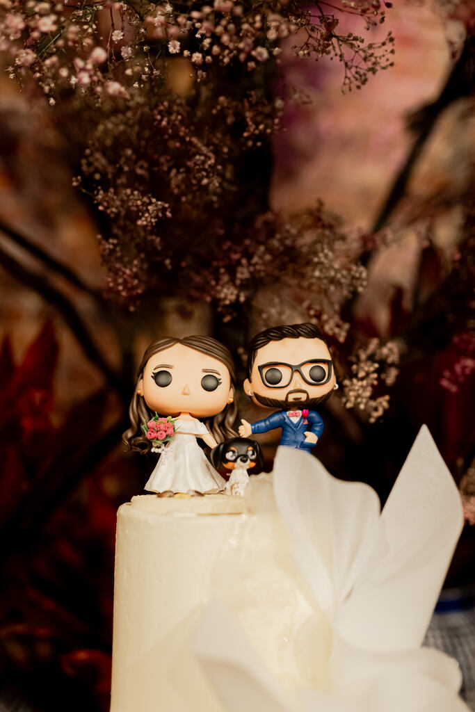 Por exemplo, o topo de bolo tipo Funko, meias divertidas para os padrinhos, pintura ao vivo e azeite aromatizado com alecrim e manjericão feito em casa para os convidados.