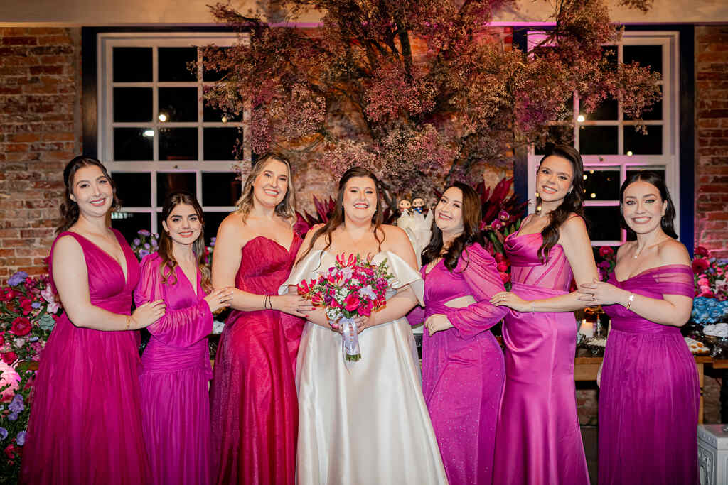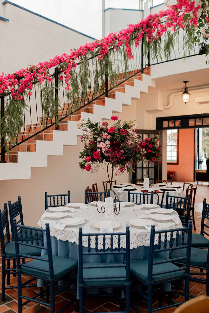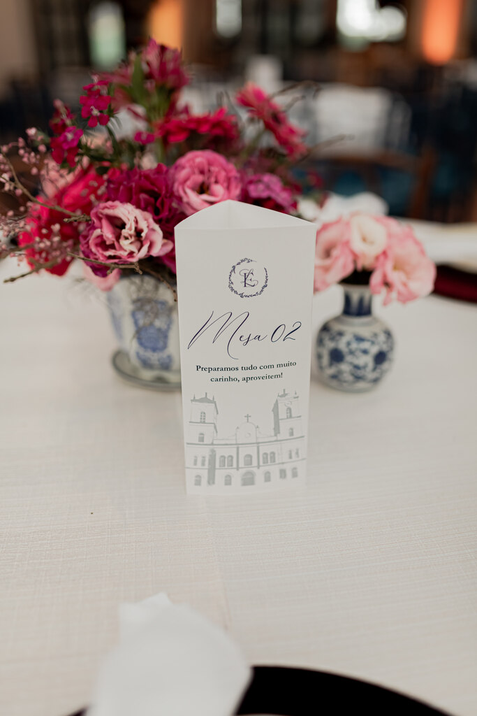 Por isso escolhi azul escuro com branco em tudo e as madrinhas e flores eram fúcsia pra destacar mesmo, nada discreto, tipo a gente.”