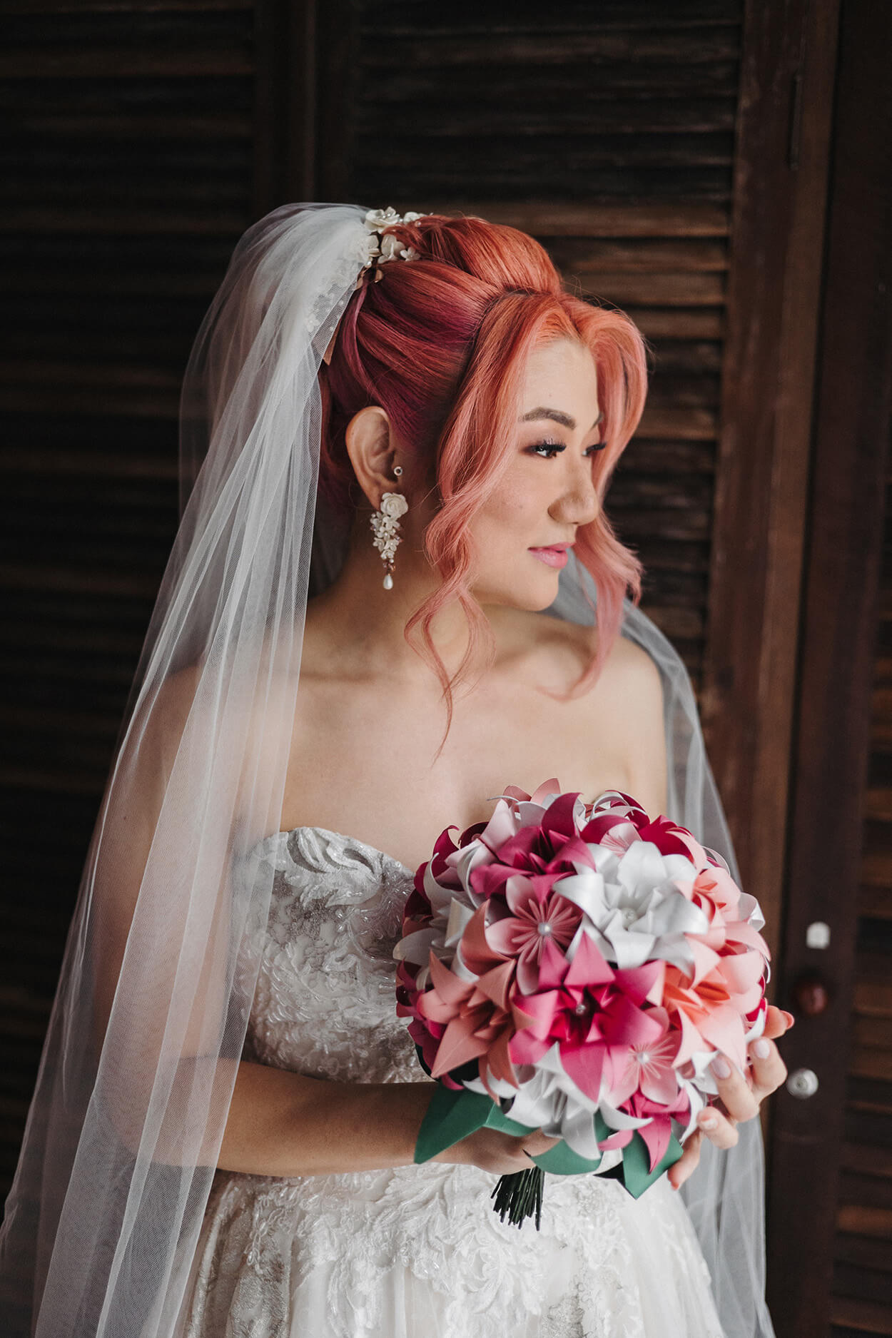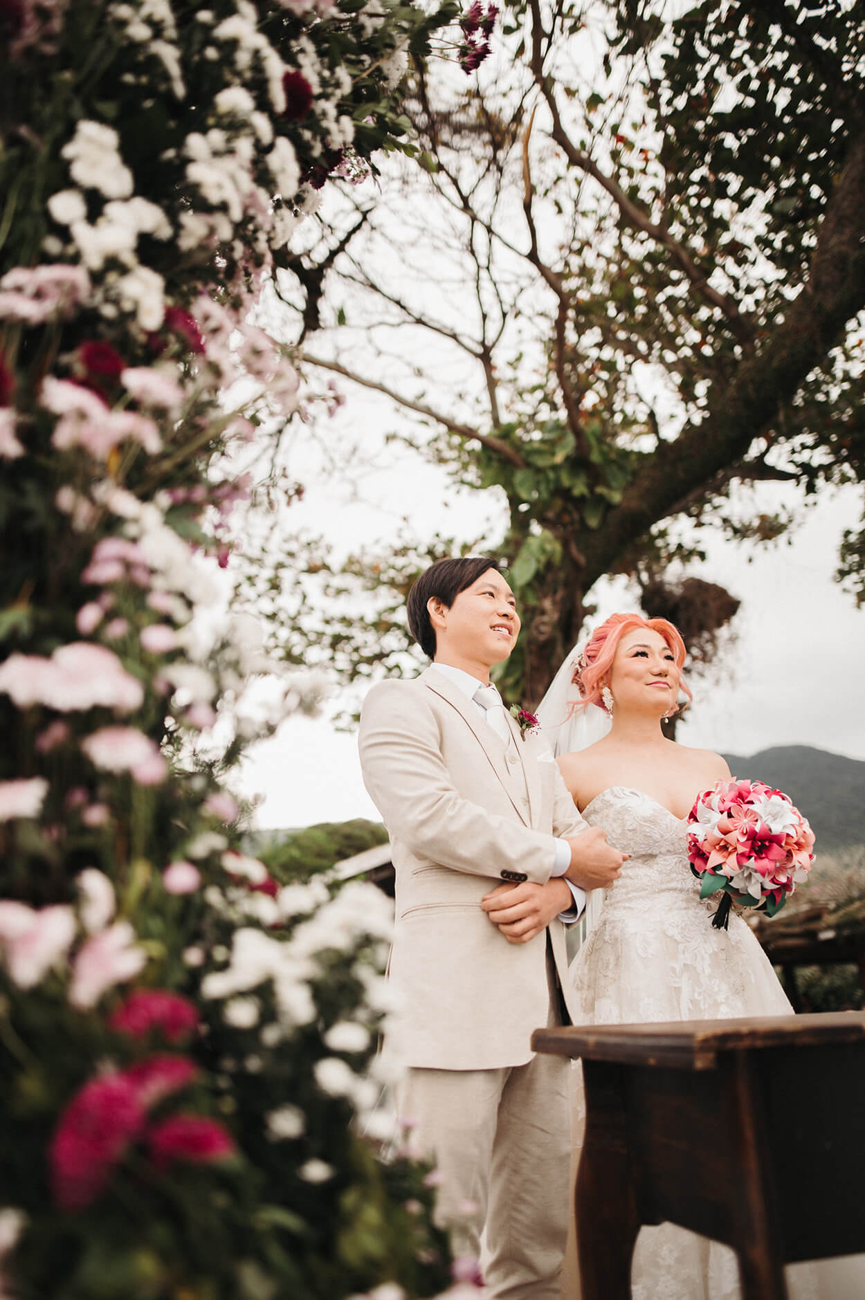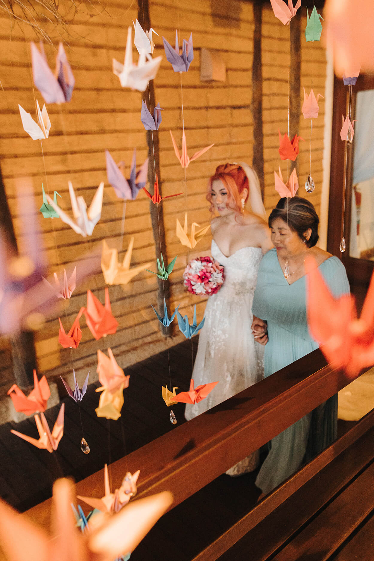 A noiva fez um monte de coisas! Começando pelos convites. Depois vieram a papelaria, lágrimas de alegria, cones de flores desidratadas para a saída dos noivos e cortina com mil tsurus para decoração.