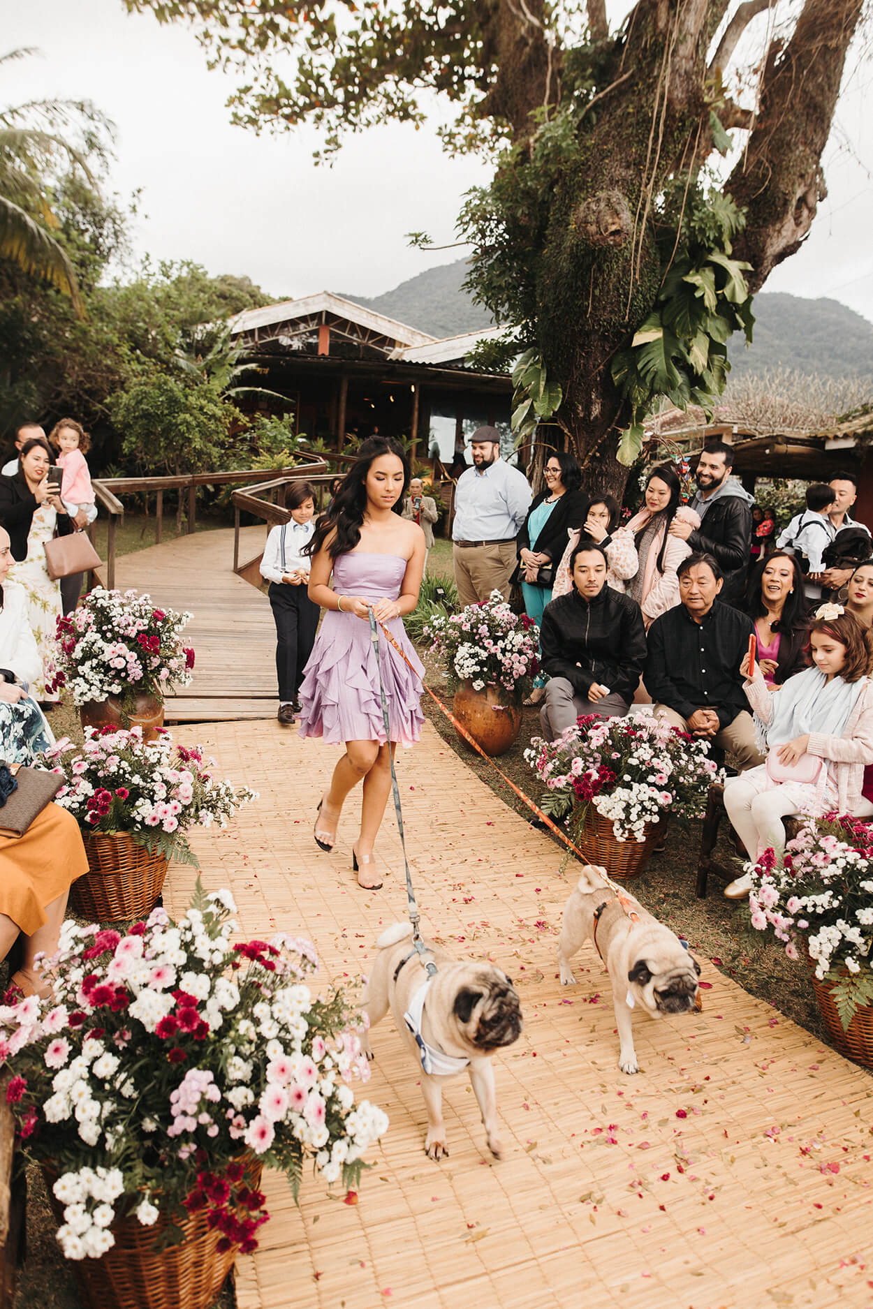 Até hoje comentam sobre. Outro episódio, foi a entrada de nossos doguinhos com as daminhas e o pajem. Ficamos super emocionados e orgulhosos por eles entrarem direitinho, sem fazer bagunça.”