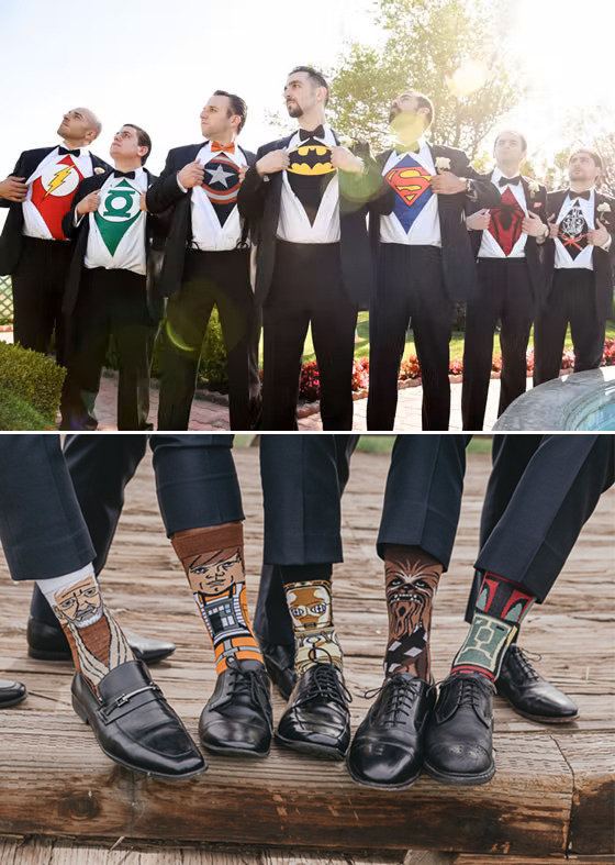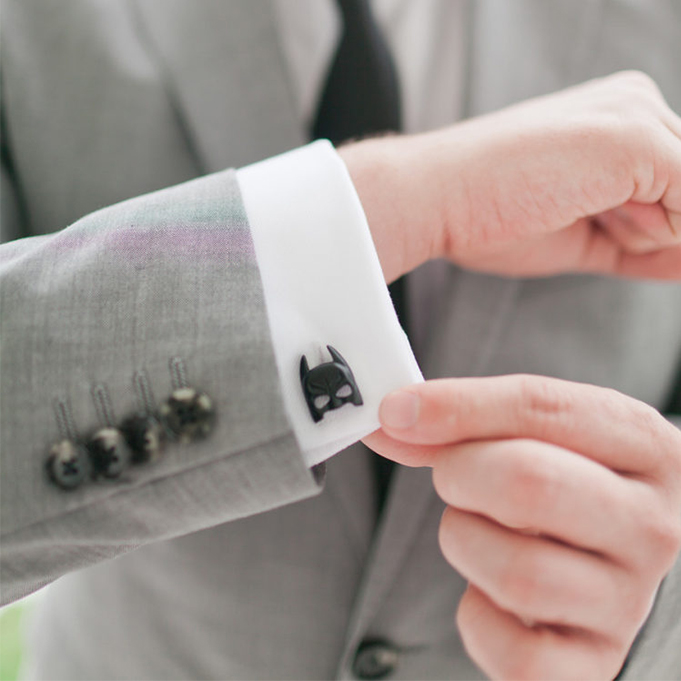 Outra forma de trazer a temática de casamento geek para o traje do noivo também são nos pequenos detalhes como abotoaduras, gravata, lapelas e meias.