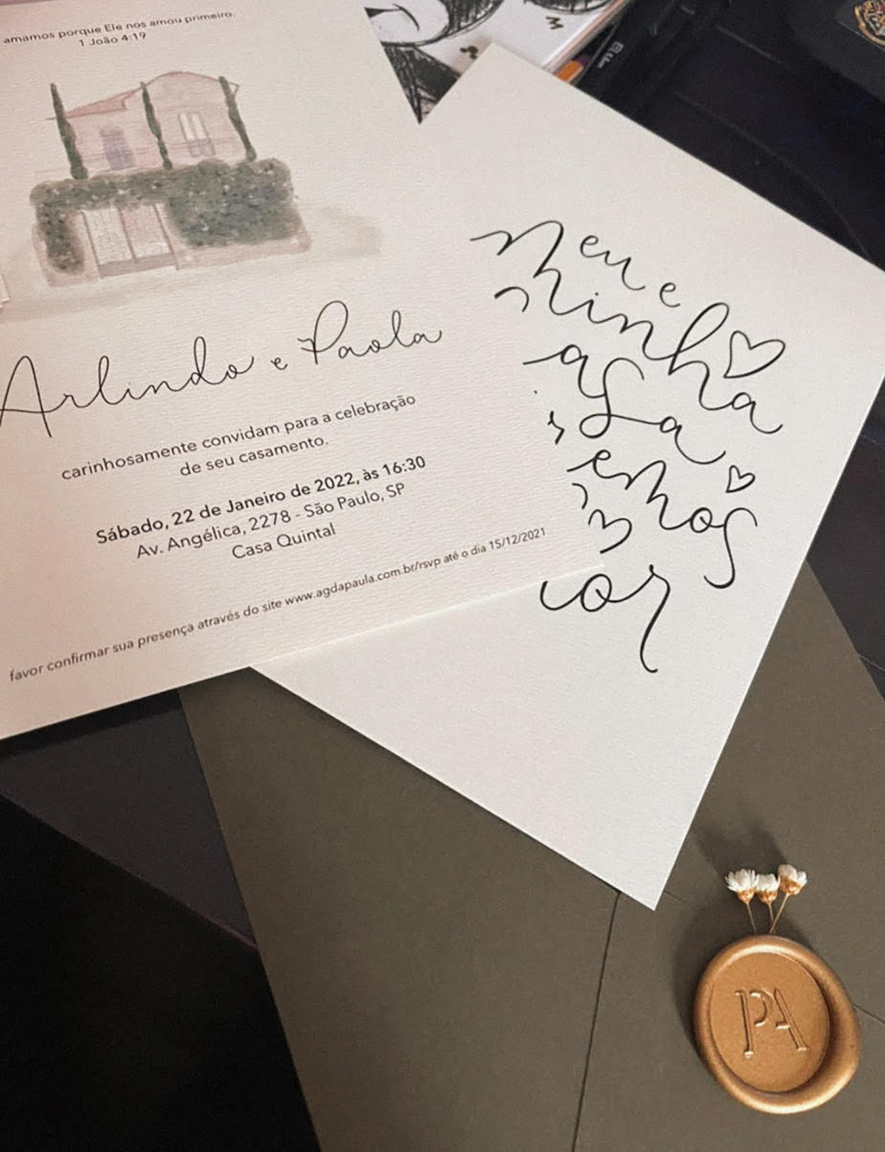 A Paola ainda desenvolveu a identidade visual e, ainda, fez um a um os convites em aquarela. “Também montei os menus, o número das mesas, a placa de entrada e o caderno de recados”. E para mimar os convidados, todos receberam um lettering para enquadrar!