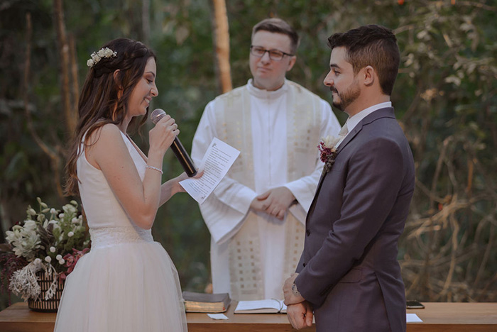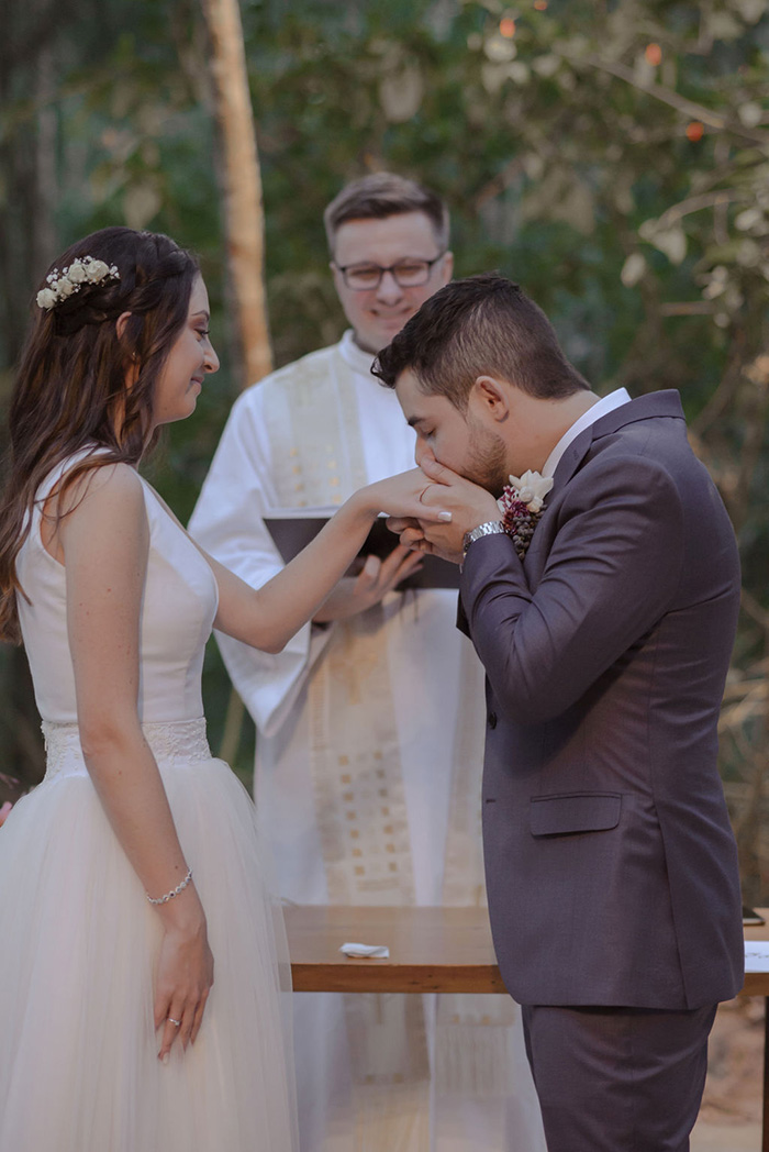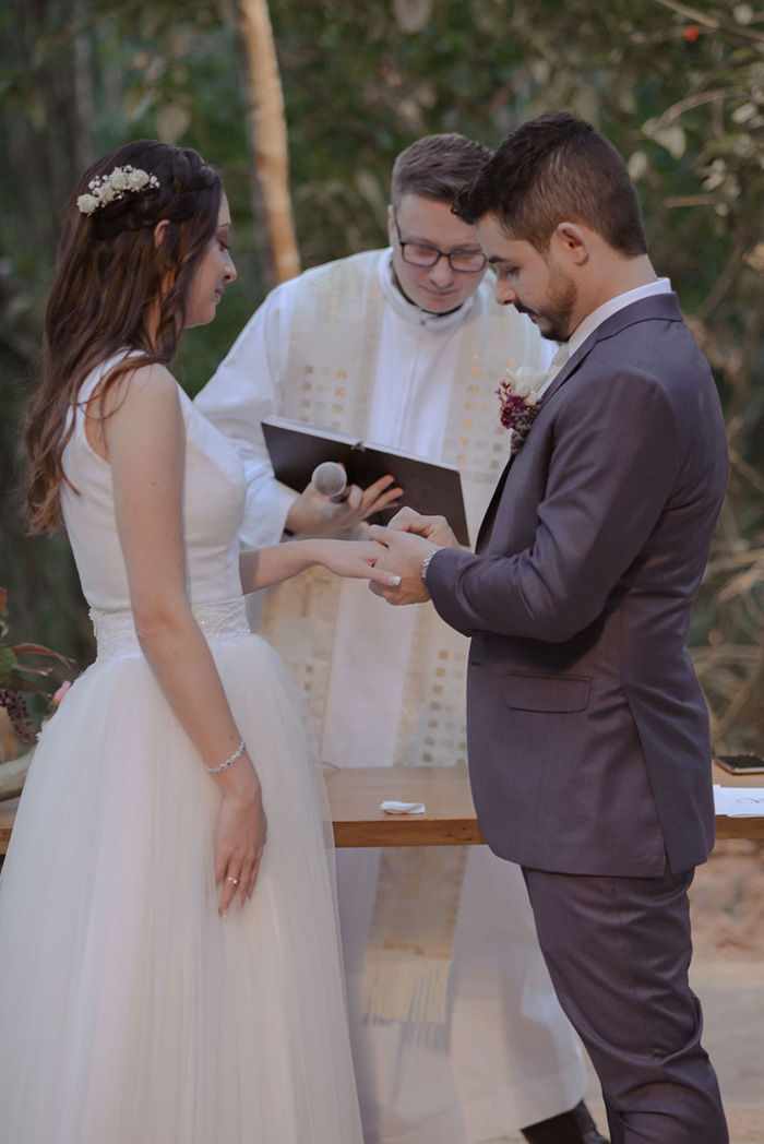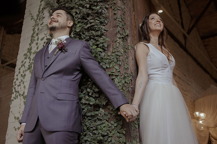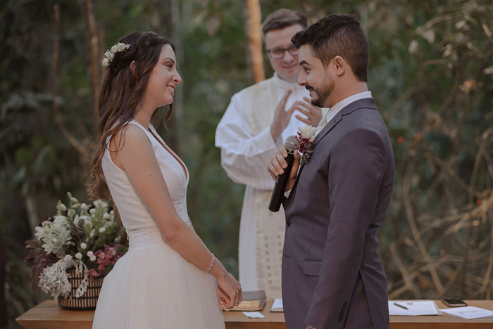 Eles já moravam juntos quando decidiram celebrar seu amor, e optaram por uma celebração leve, com pegada rústica e cerimônia ao ar livre. Aliás, não faltou sentimento nesse dia cheio de romantismo!