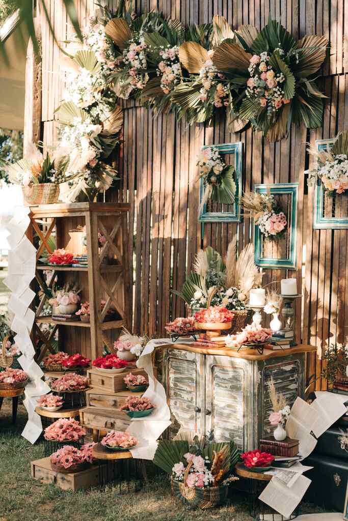 Outro ponto que chama muito a atenção é a disposição orgânica e charmosa dos elementos. Ah, e os arranjos com flores montados na tela de arame e emoldurados dão um ótimo diy.