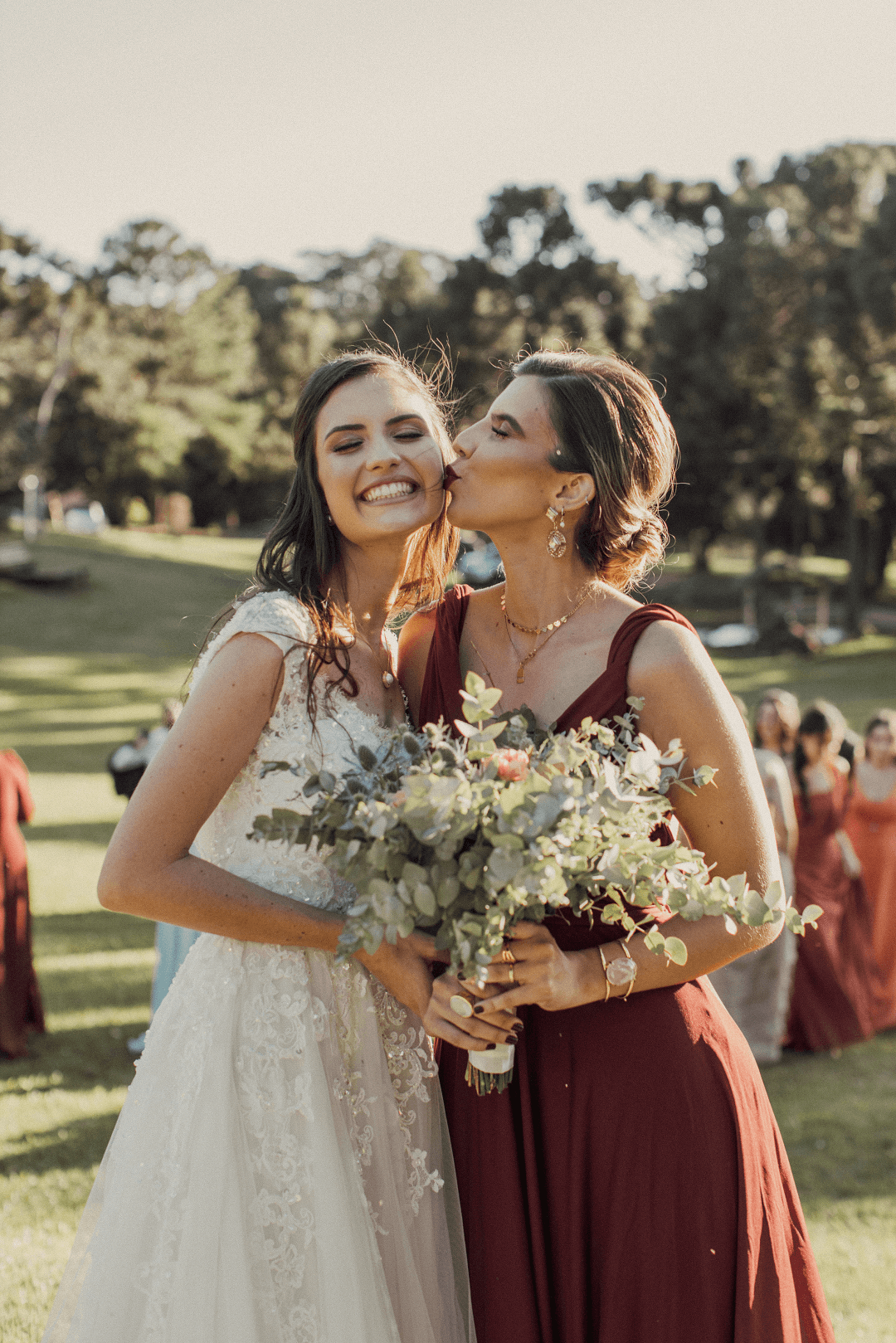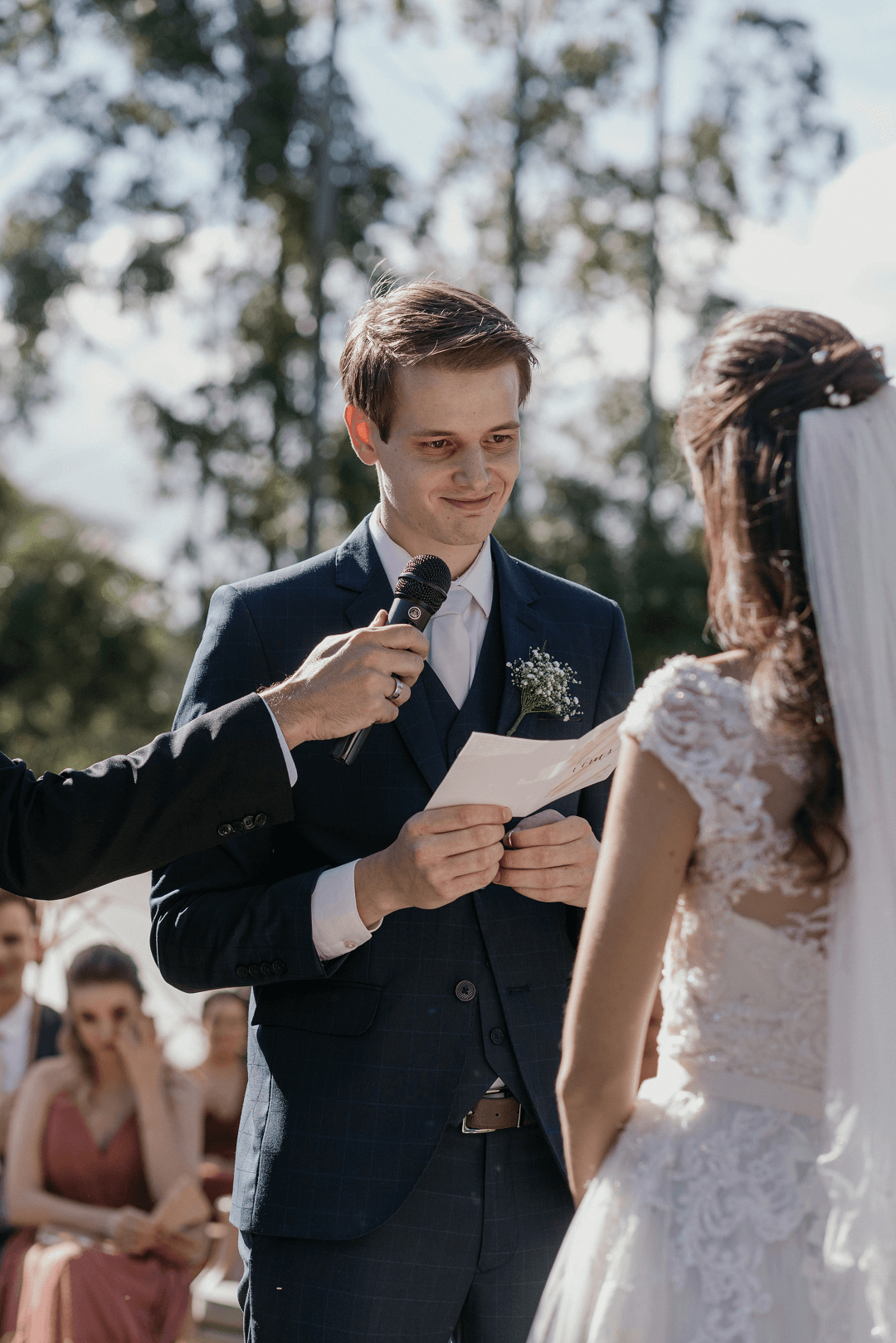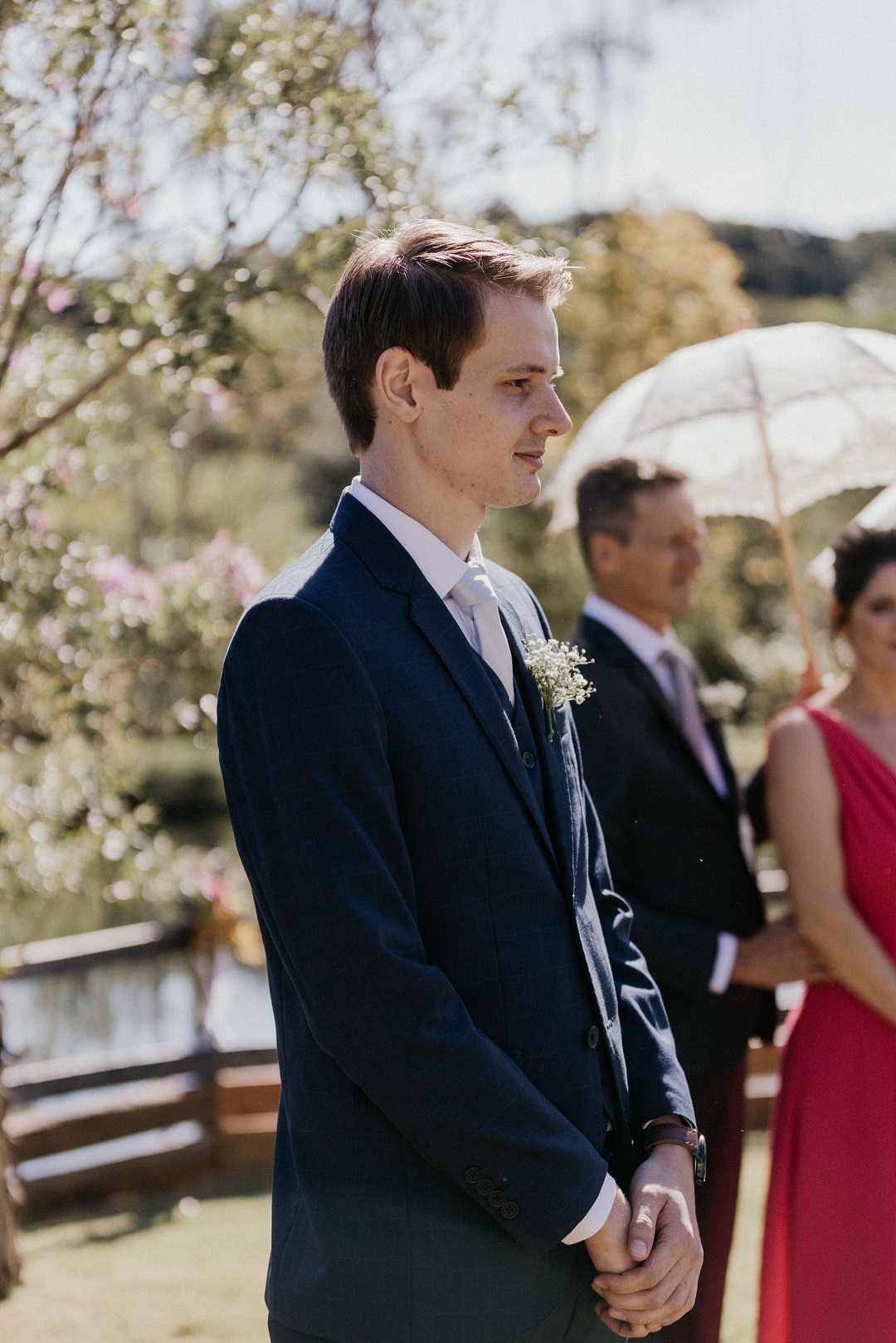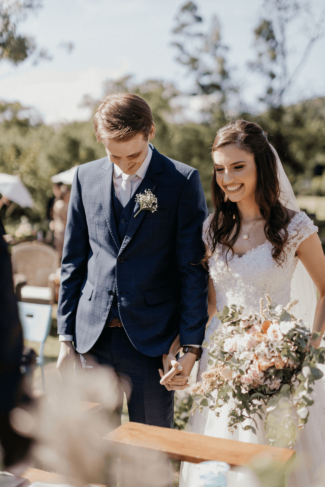 Os noivos também prepararam um discurso de agradecimento aos amigos e familiares por todo apoio em meio as mudanças que foram as semanas anteriores ao casamento. “Tivemos que reorganizar tudo em 10 dias! E também entregamos presentes aos pais: uma caixa com vinho e vela aromática, e na tampa escrito “Forever you daughter/son” = para sempre sua filha/seu filho”.