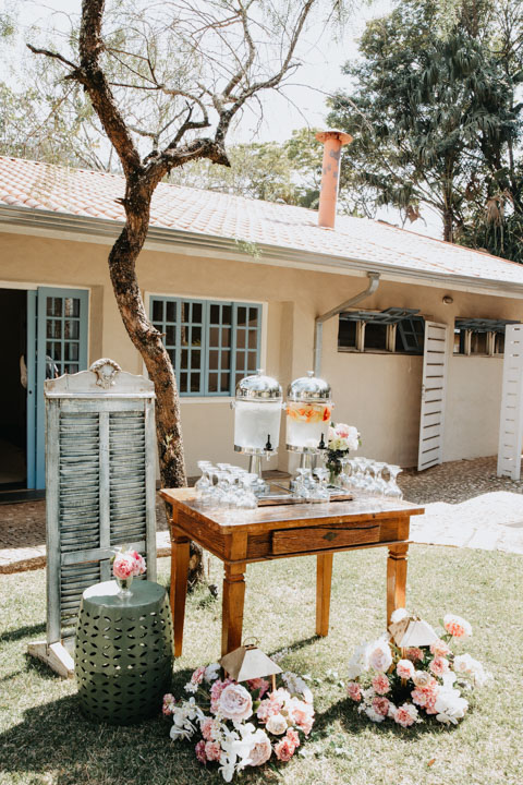 Ainda, a decoração no estilo romântico com toque rústico, ficou perfeita em tons de verde, rosa, amarelo e branco.