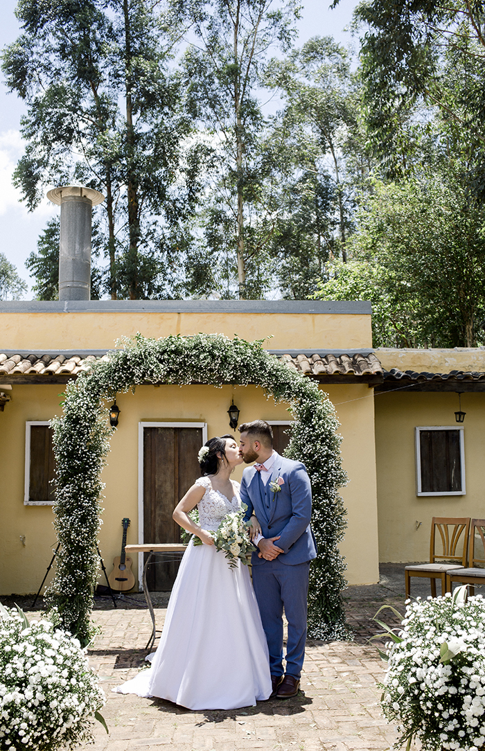 Para o grande dia, Raquel e Matheus contam que: “Buscamos muitas inspirações de casamento no campo apostando nos tons de verde e branco que harmonizam com a natureza e realçam as cores da paisagem natural do lugar”.